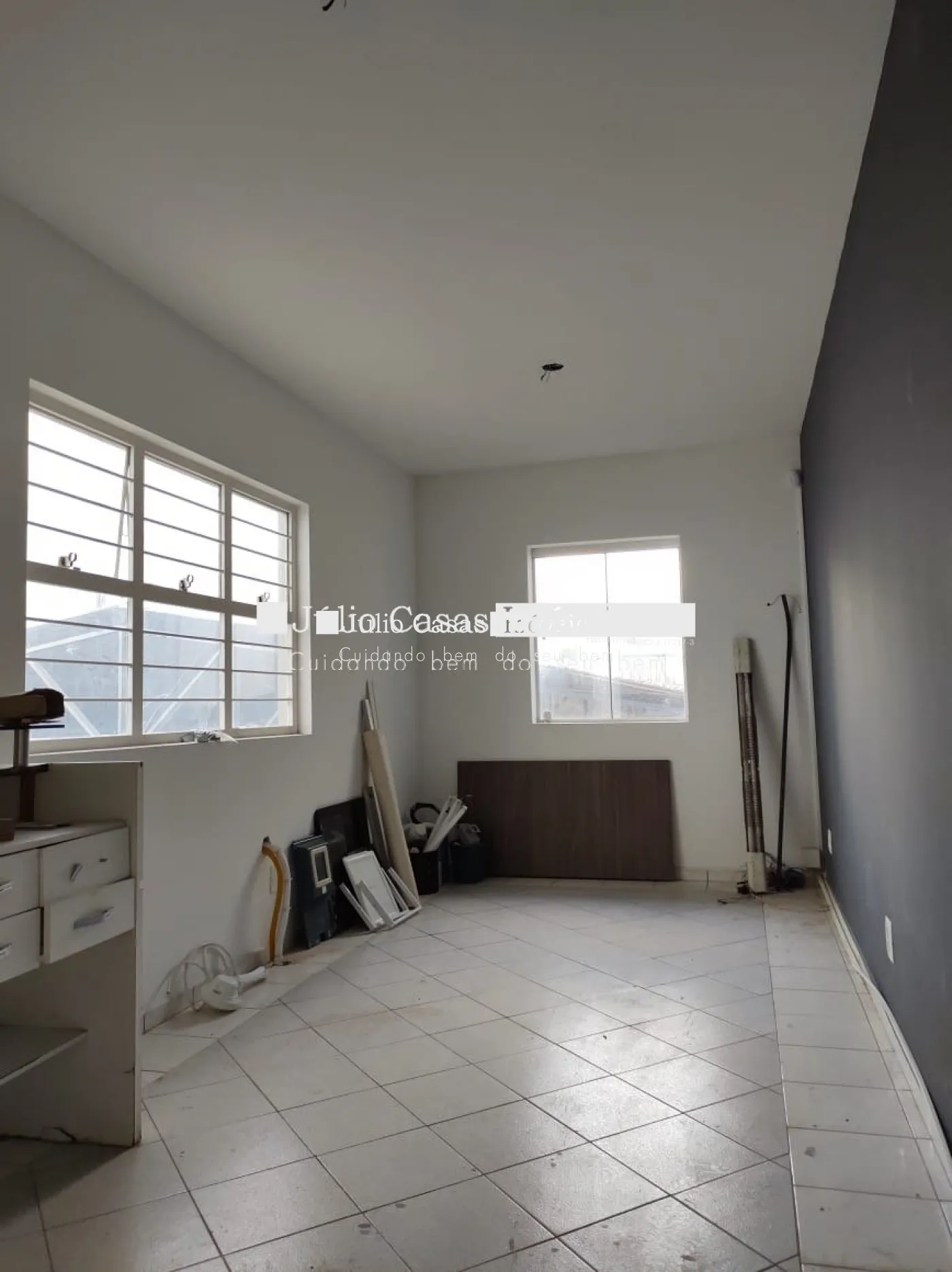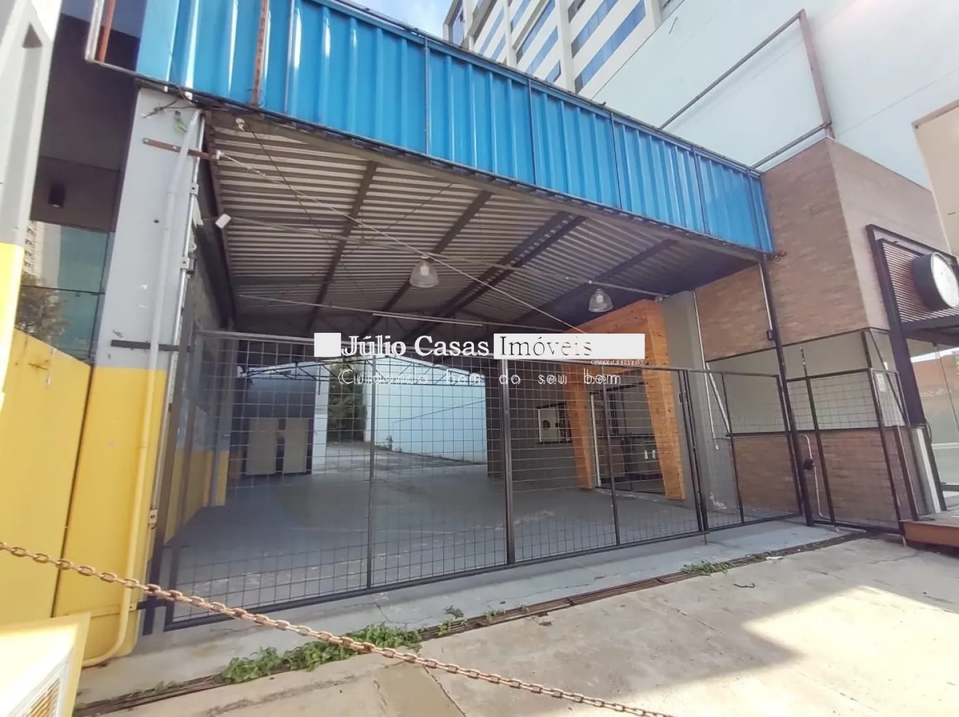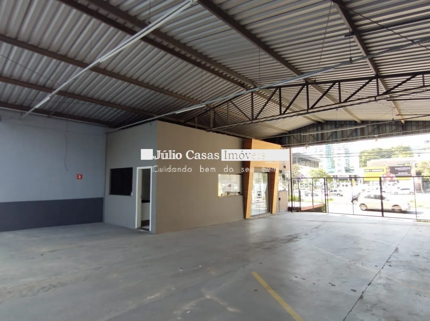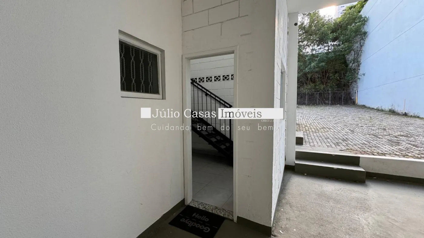 Nos fundos, há dois banheiros, um deles com acessibilidade. O espaço também conta com um box coberto para lavagem de carros e duas salas que podem ser utilizadas como escritório ou depósito.
