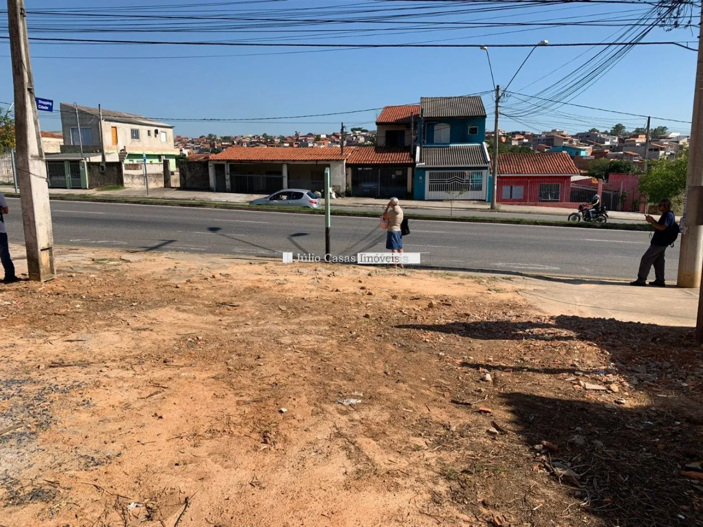 fluxo de veículos e pedestres, com ponto de ônibus em frente.