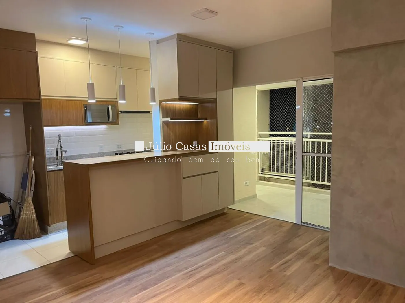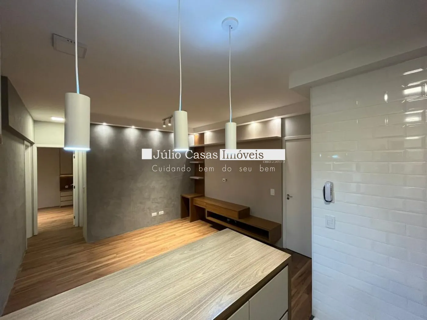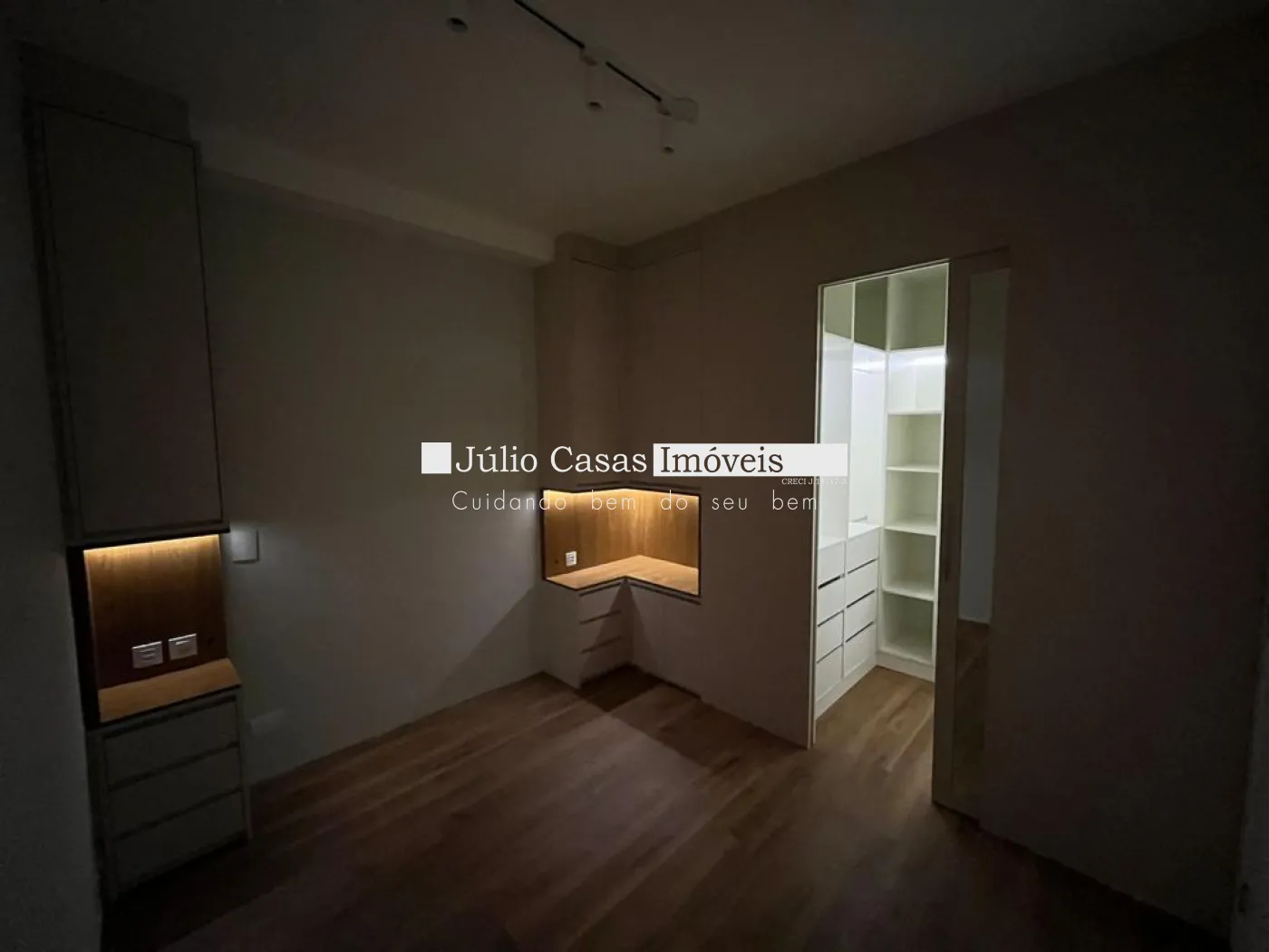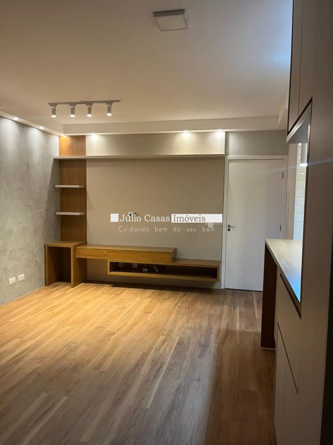 Sala para dois ambientes com painel planejado, adega embutida, balcão com armários e ar condicionado inteligente com conectividade pela Alexia ou aplicativo.