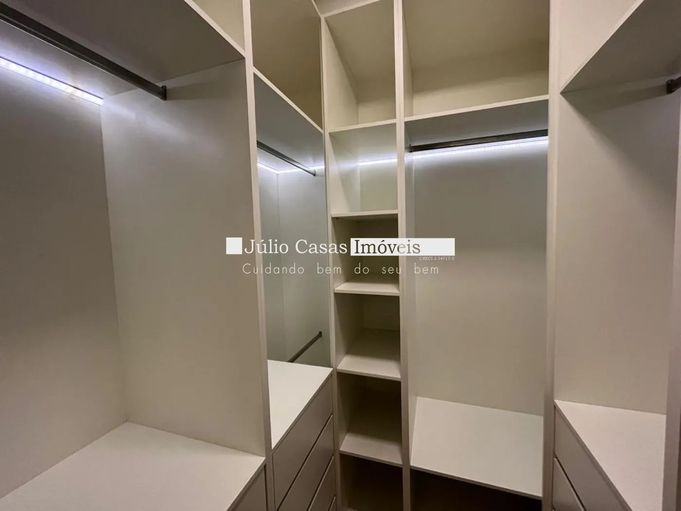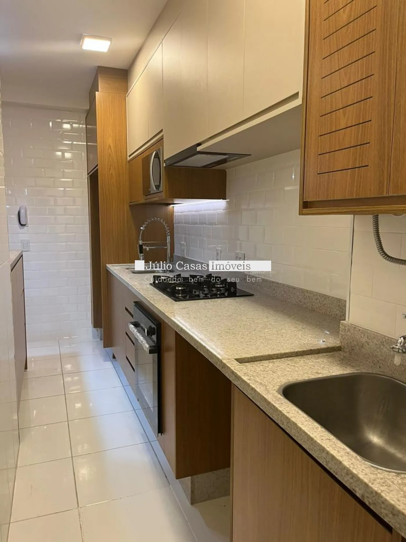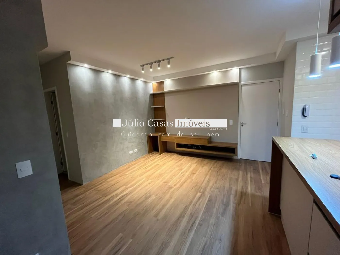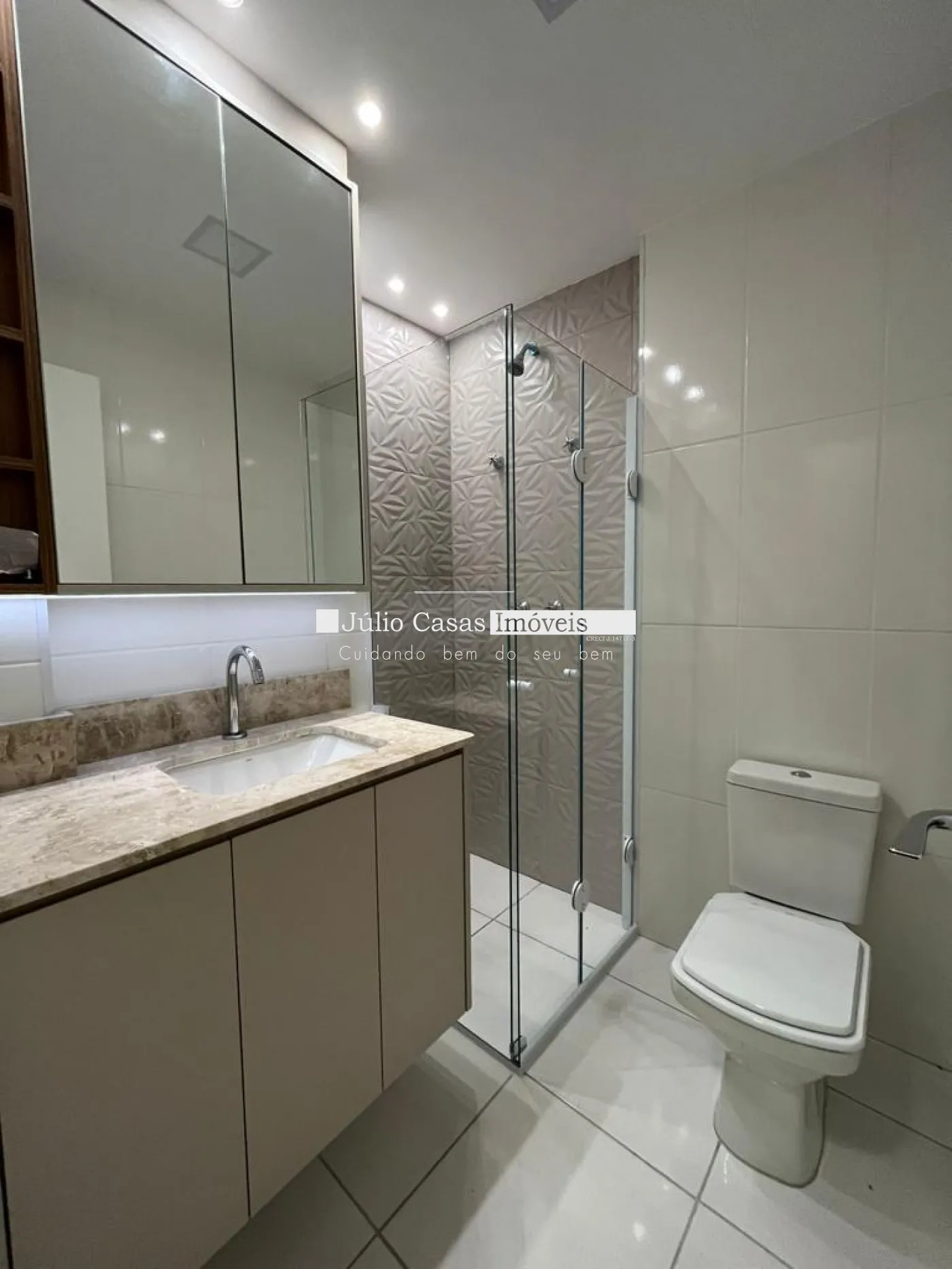 Sala para dois ambientes com painel planejado, adega embutida, balcão com armários e ar condicionado inteligente com conectividade pela Alexia ou aplicativo.