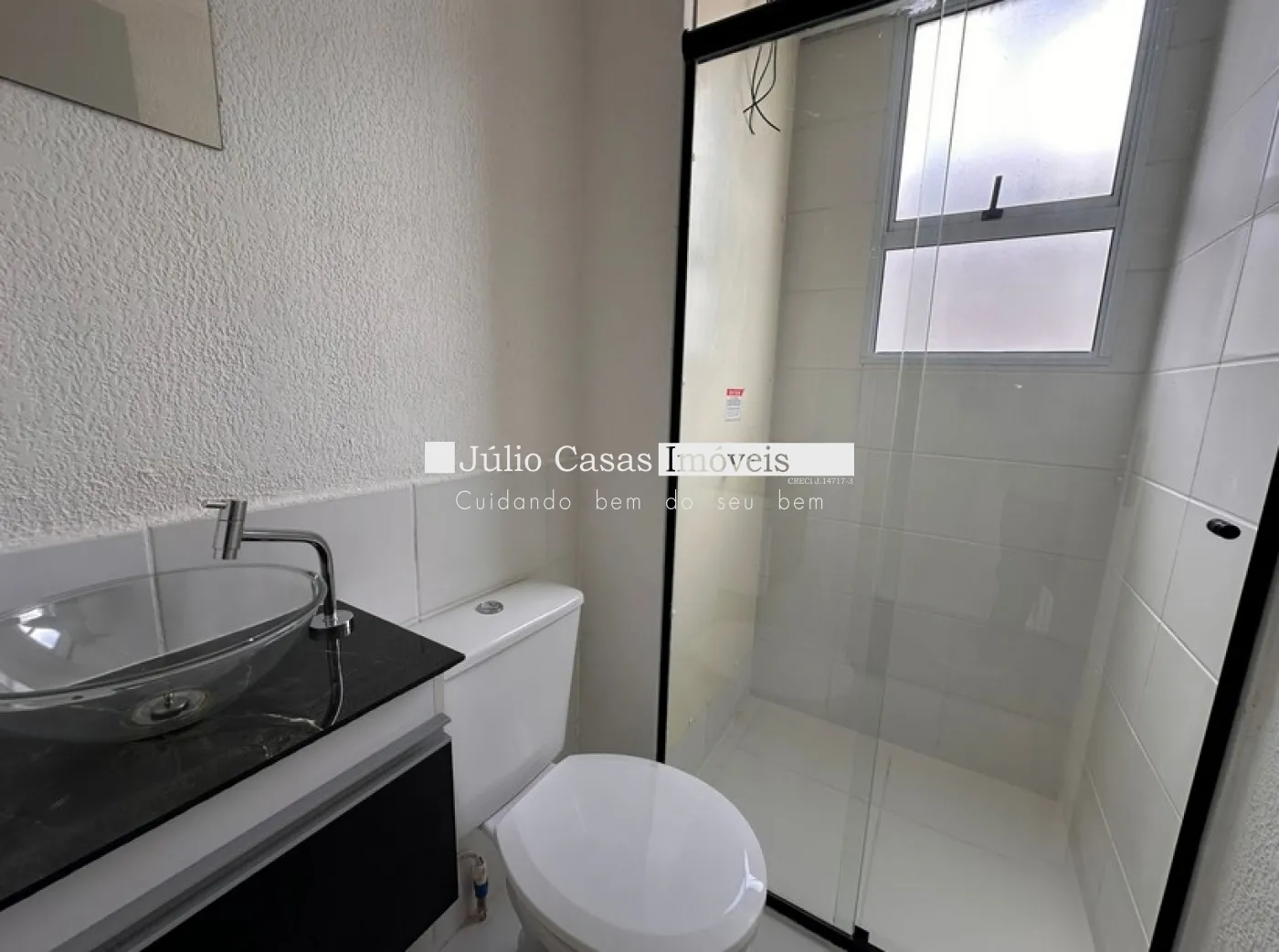 - Banheiro social moderno, equipado com box em vidro temperado.