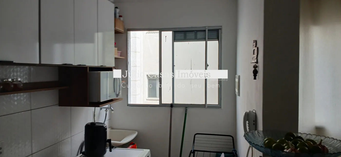 Apartamento a venda com sala ampla, cozinha com armários, área de serviço separada, wc social com box em vidro e gabinetes, 2 quartos. Apartamento todo em piso cerâmico. Sala com ventilador de teto. Condomínio com portaria 24 h, playground, salão de festas, quadra poliesportiva. 1 vaga de garagem descoberta.