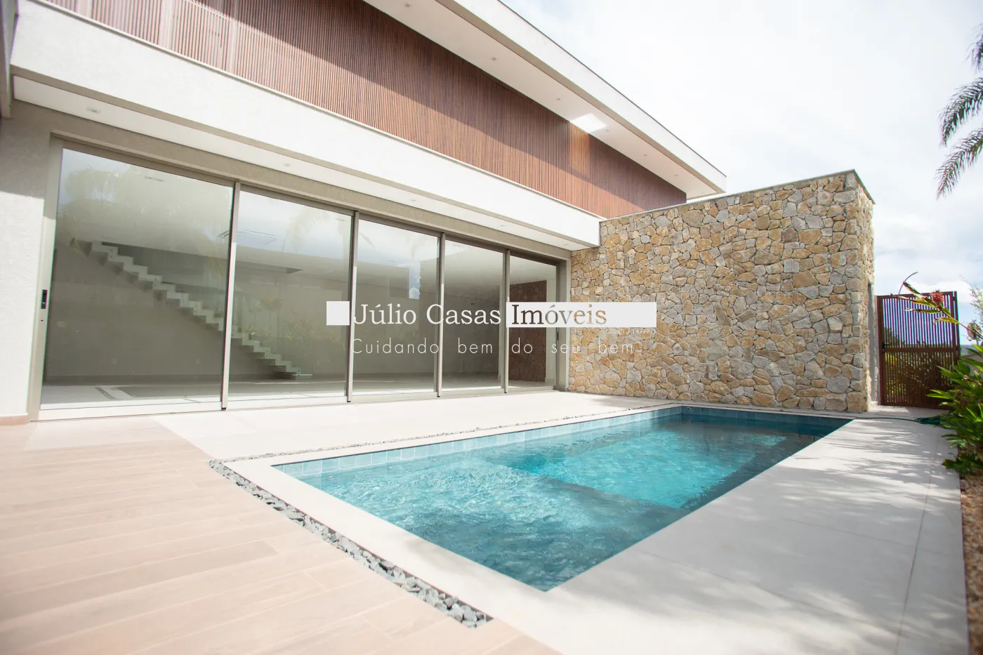 No piso térreo, a casa conta com um lavabo, sala de home theater, sala de estar, sala de jantar, cozinha integrada, despensa, lavanderia, área gourmet com churrasqueira, depósito e uma maravilhosa piscina.