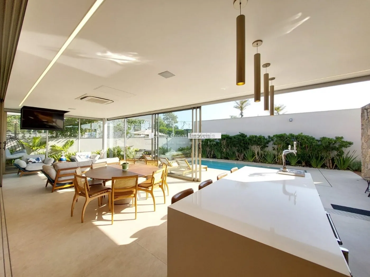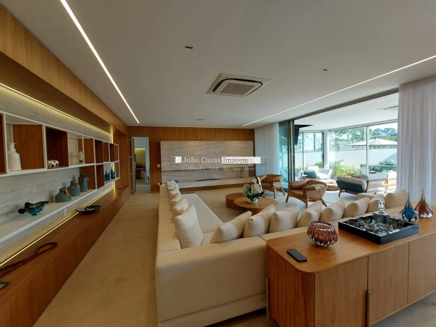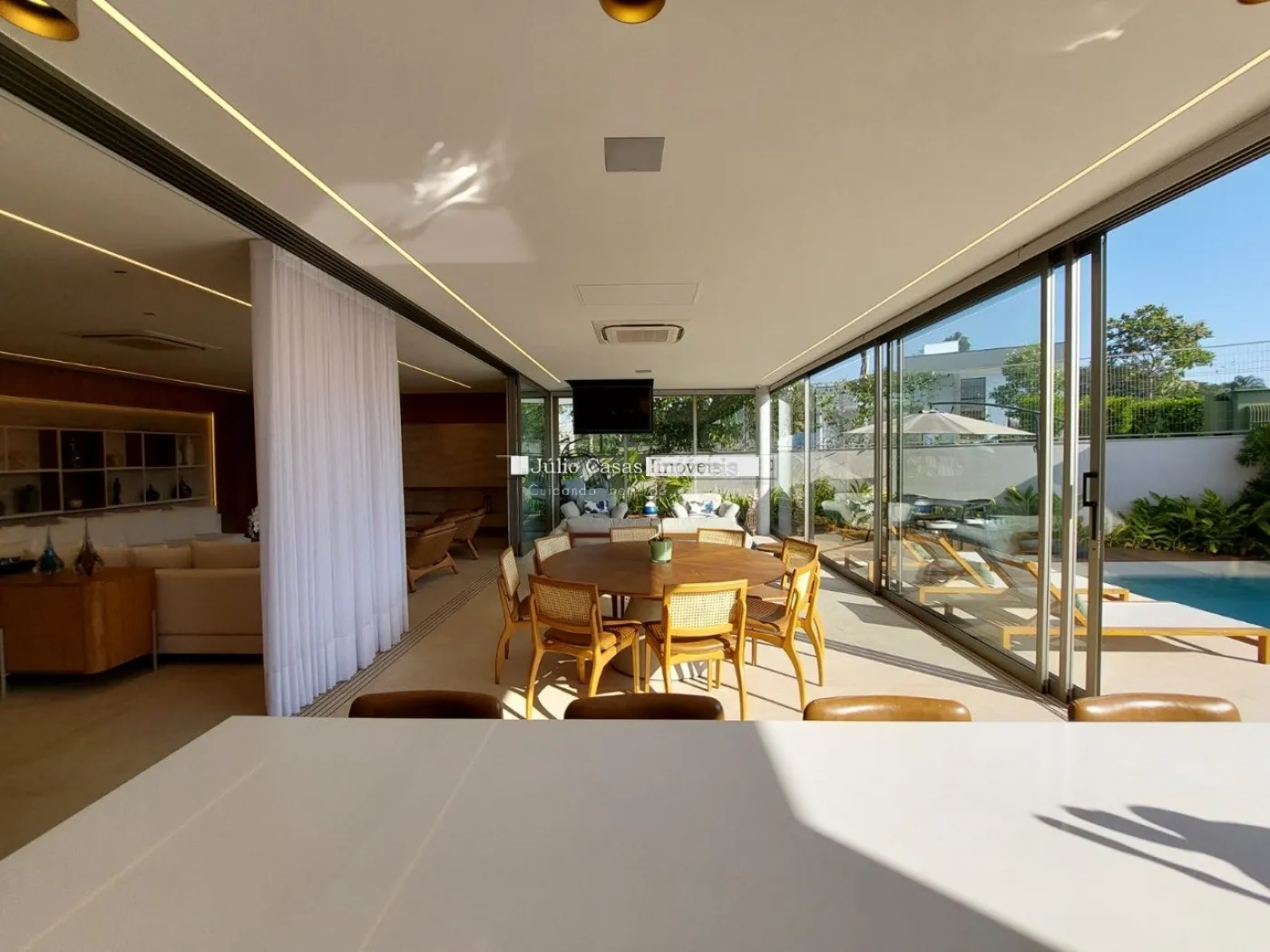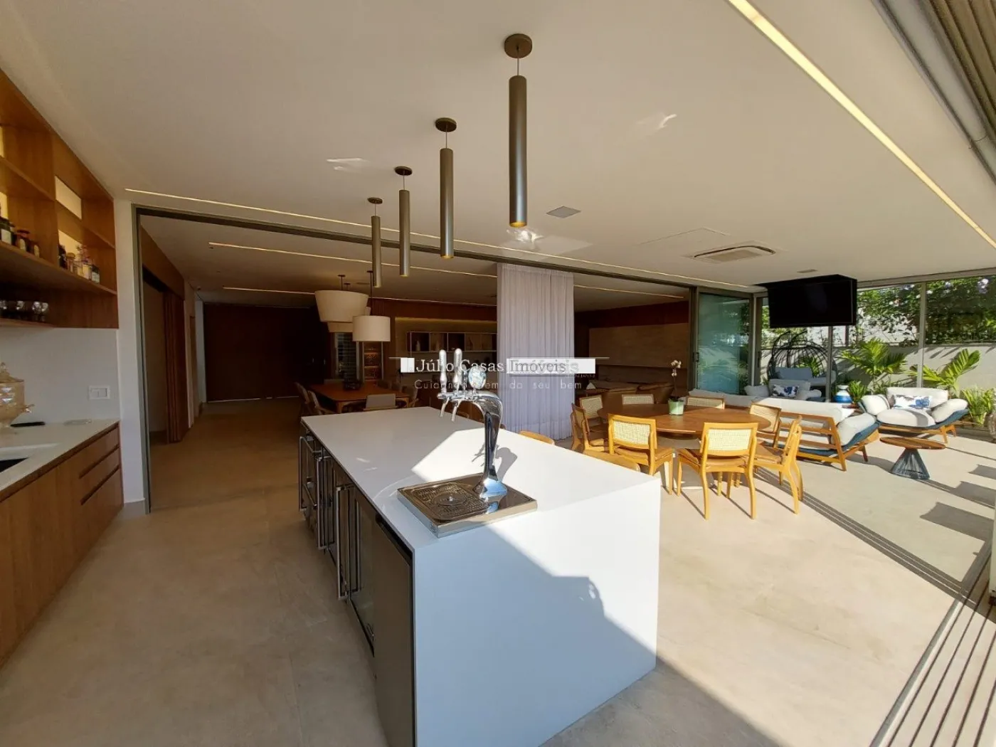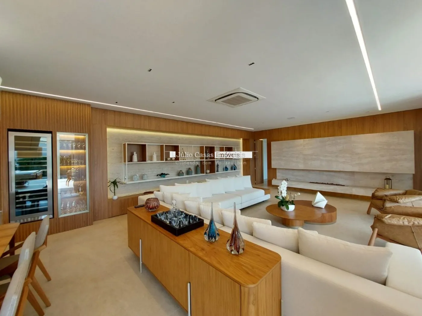 chopeira retrátil no teto, lareira ecológica, ar condicionado split Casset e cortinas automatizadas.