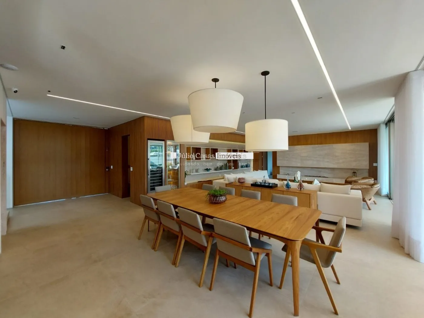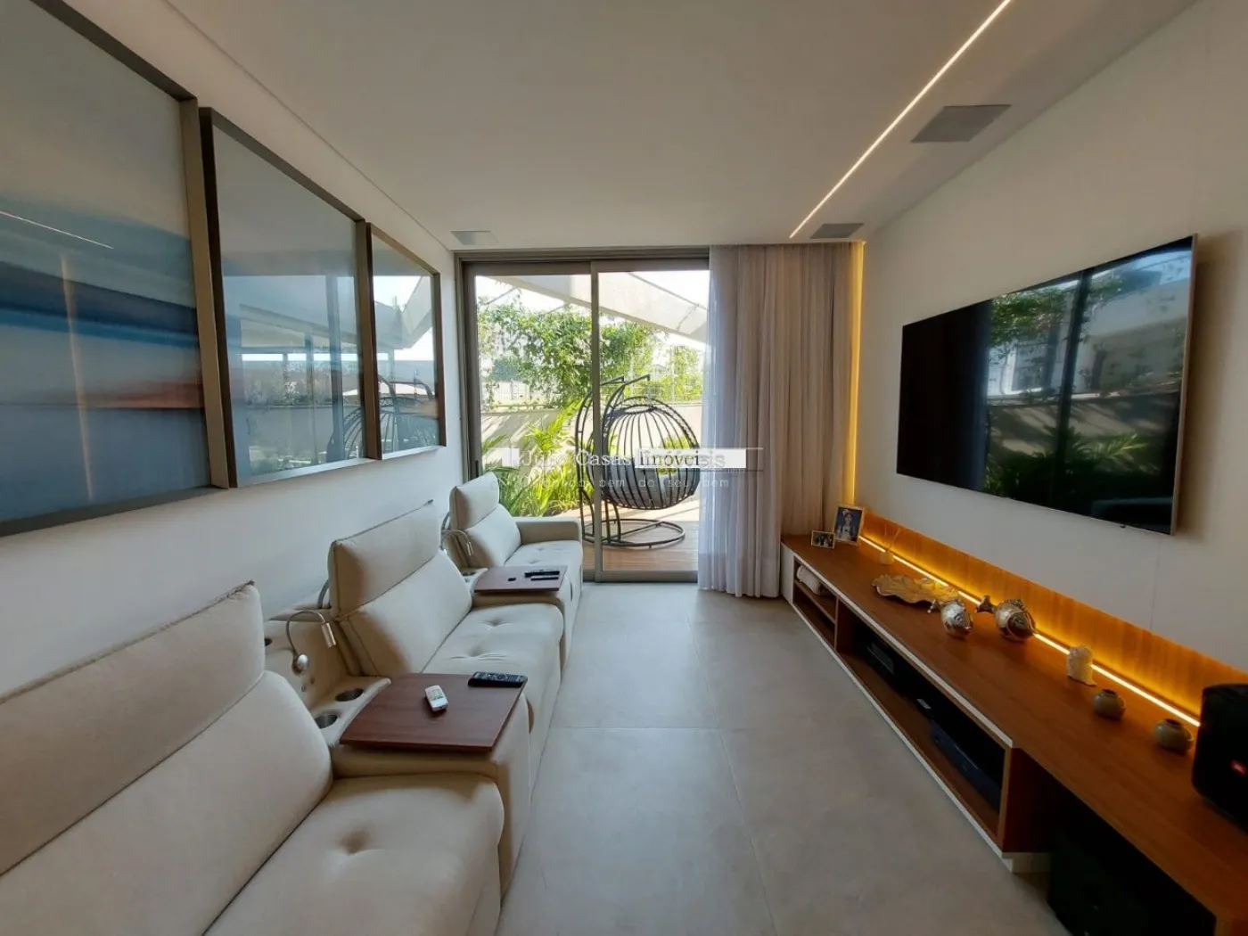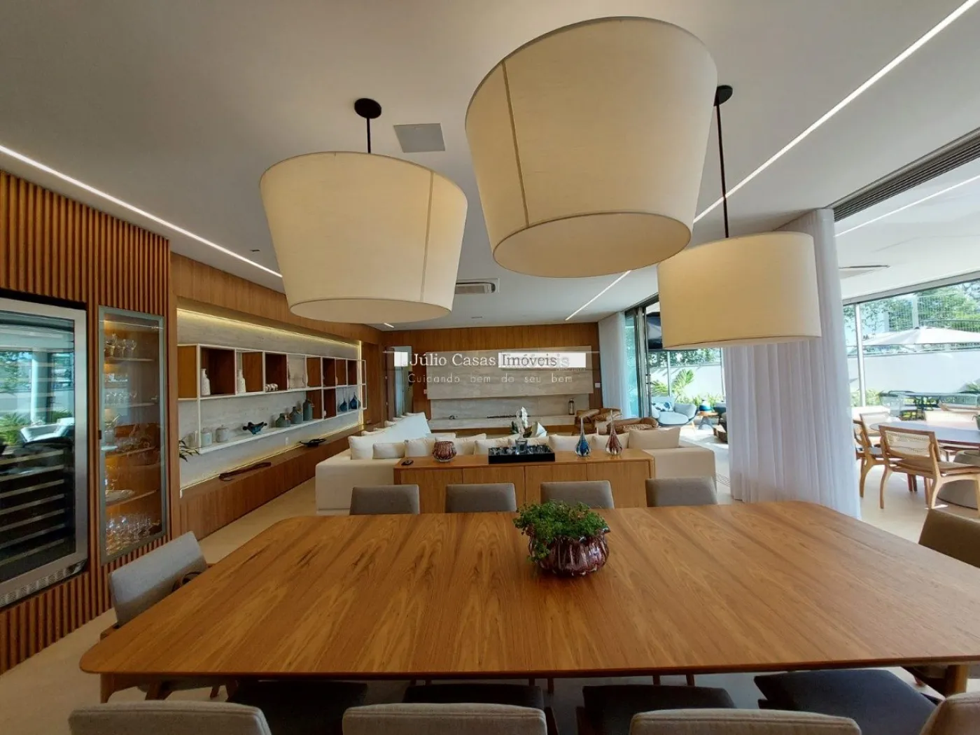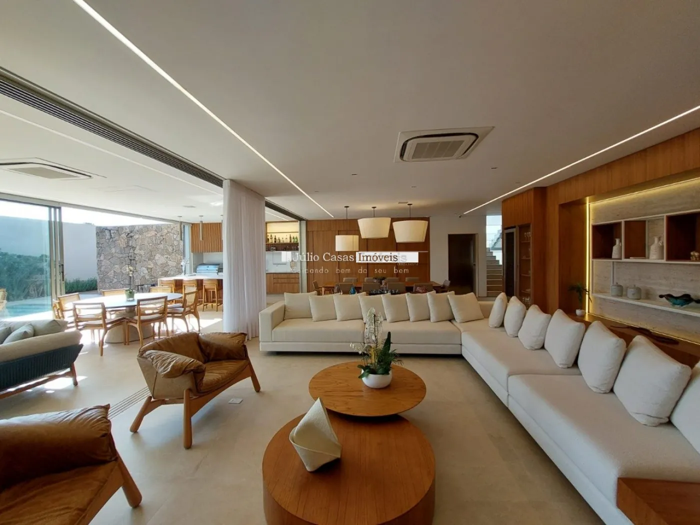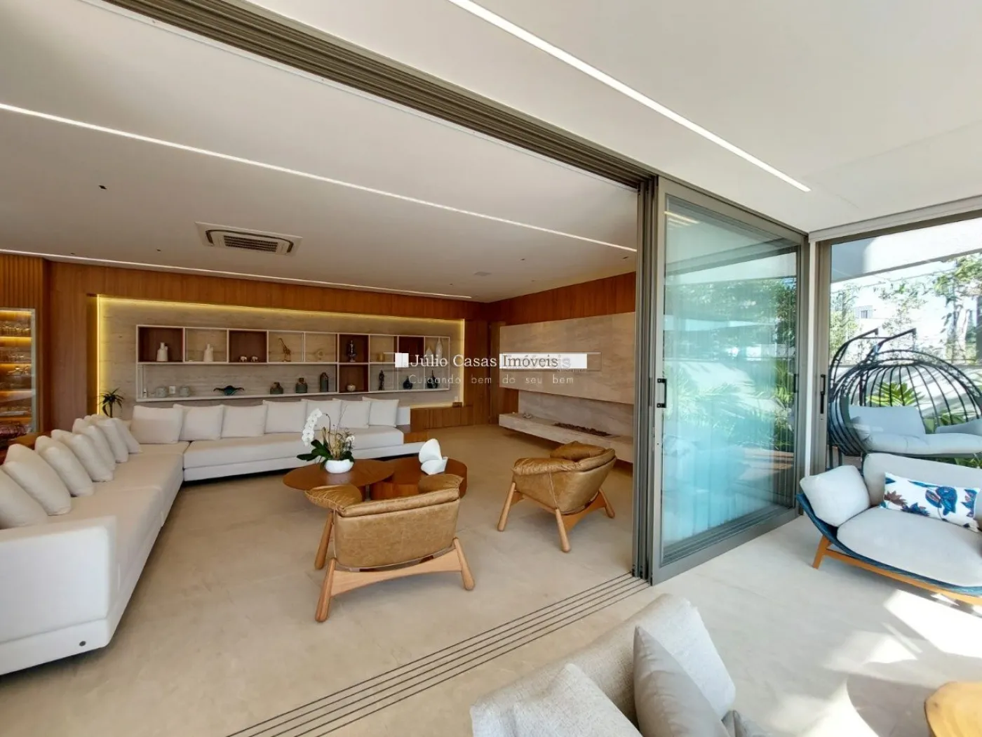 chopeira retrátil no teto, lareira ecológica, ar condicionado split Casset e cortinas automatizadas.