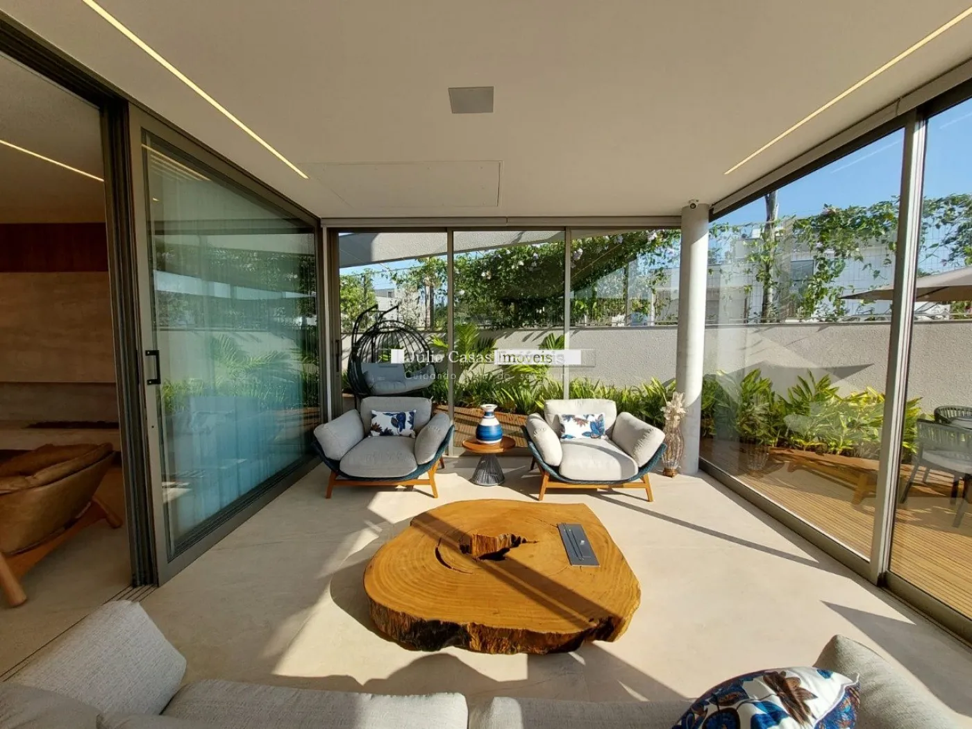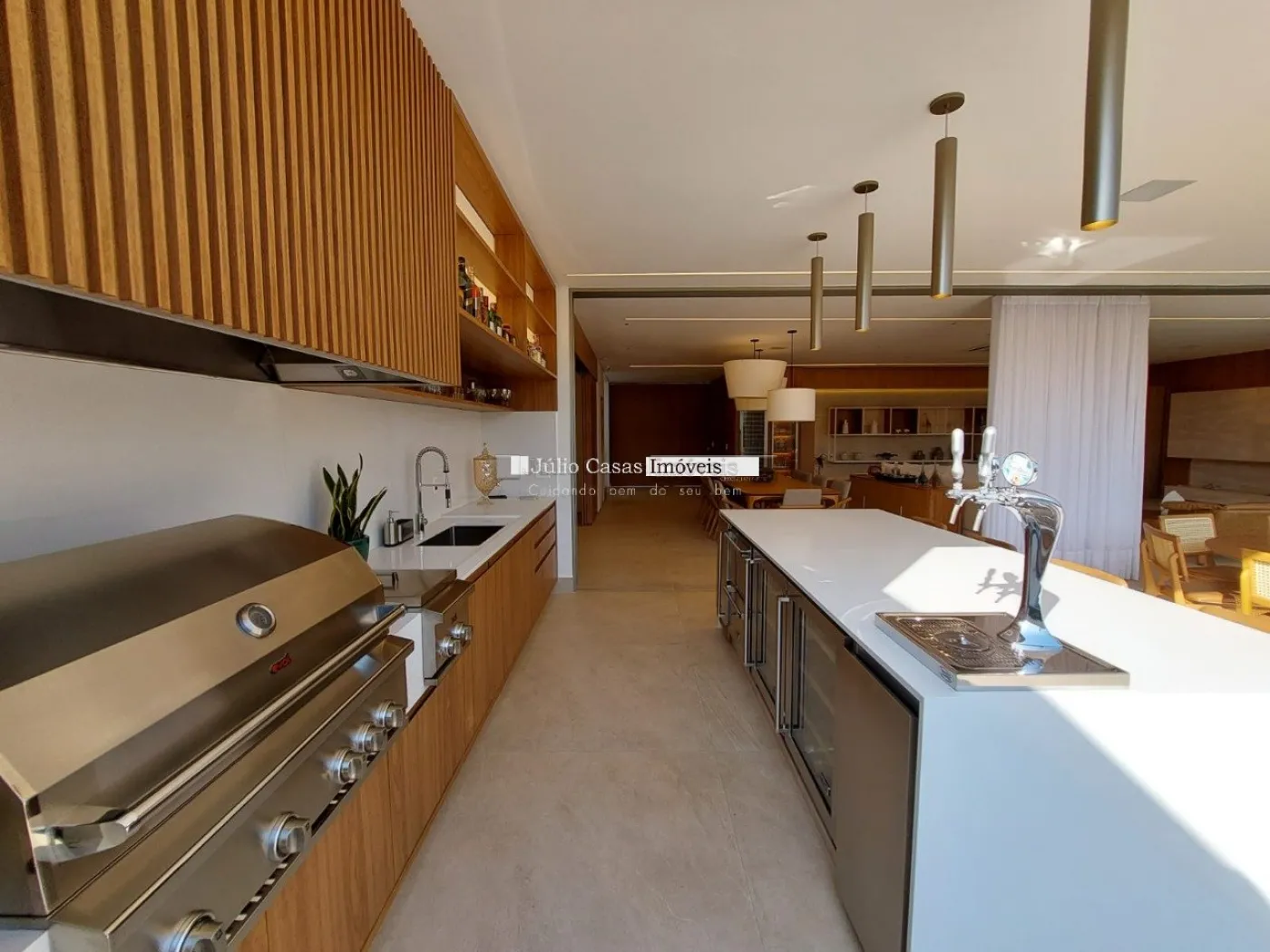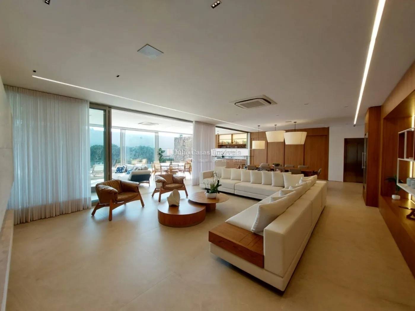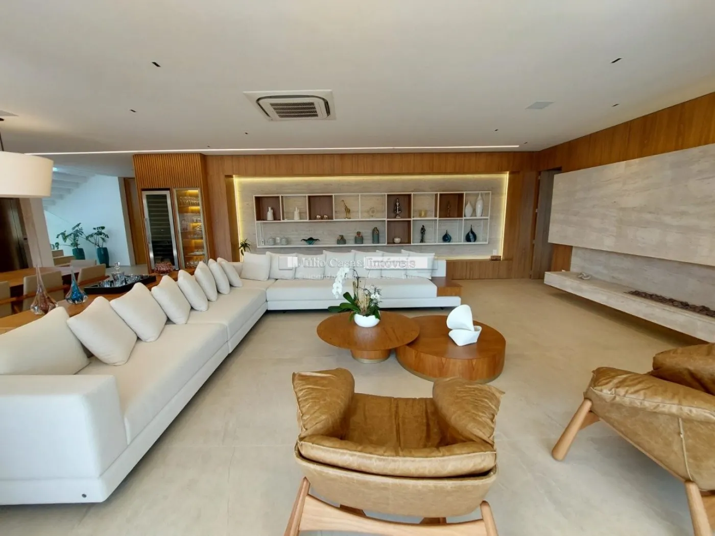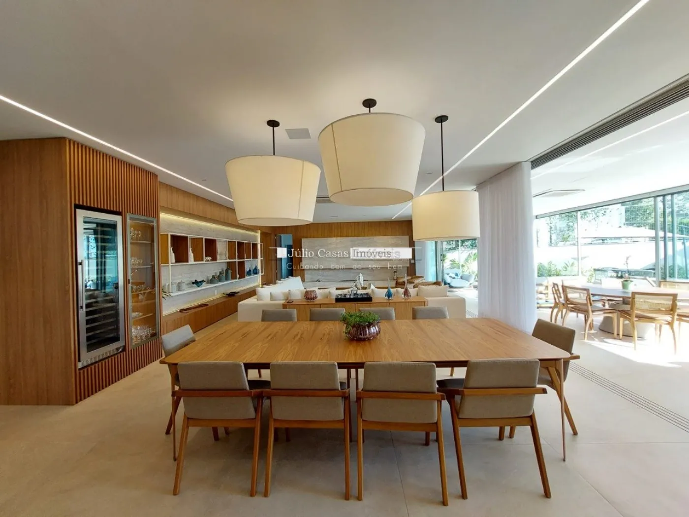 chopeira retrátil no teto, lareira ecológica, ar condicionado split Casset e cortinas automatizadas.