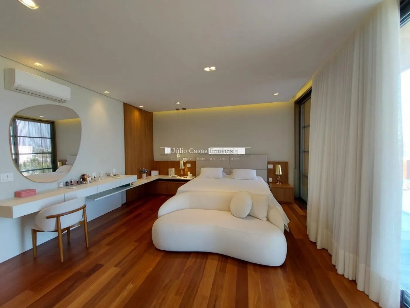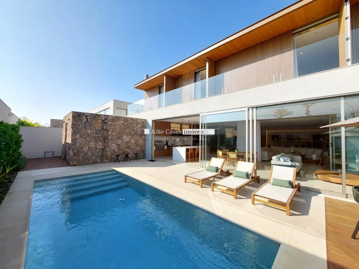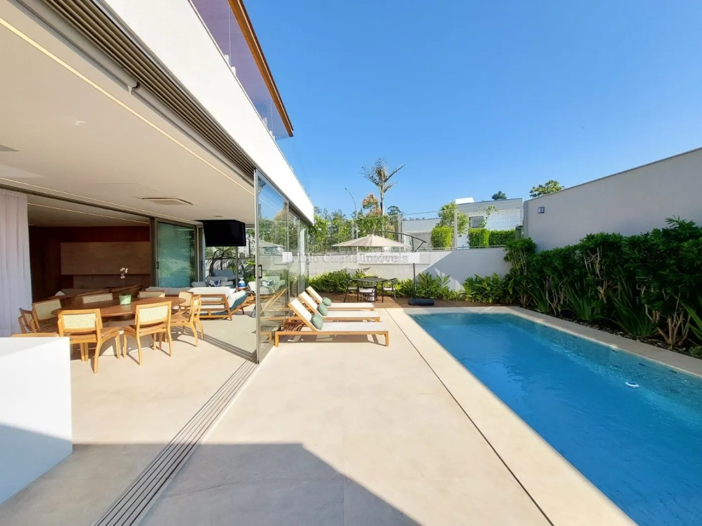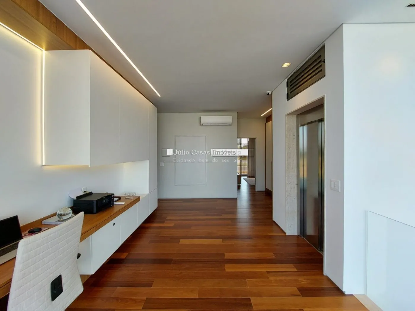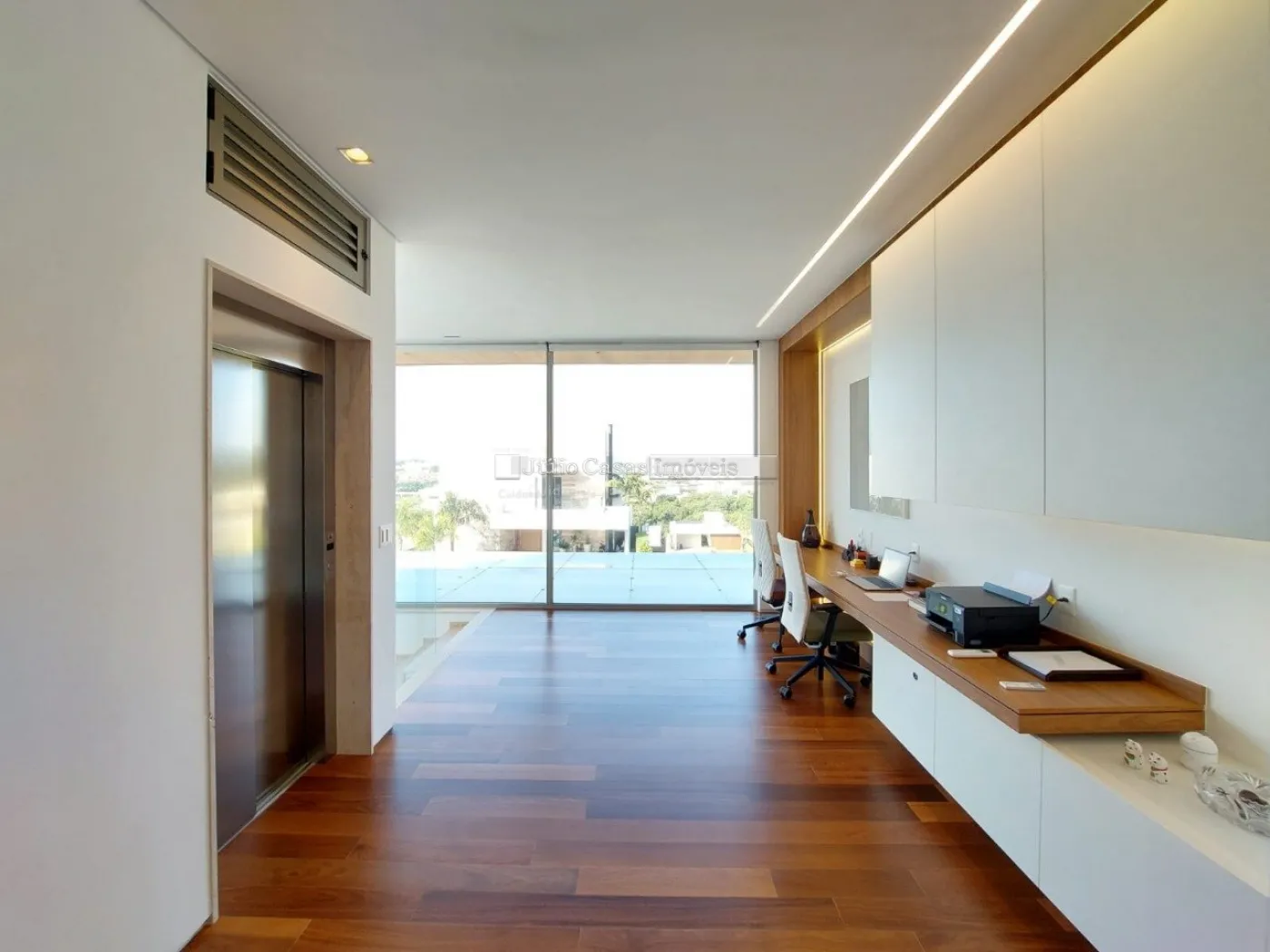 chopeira retrátil no teto, lareira ecológica, ar condicionado split Casset e cortinas automatizadas.