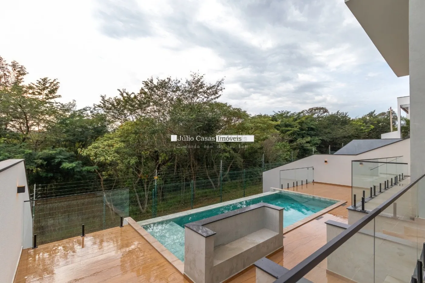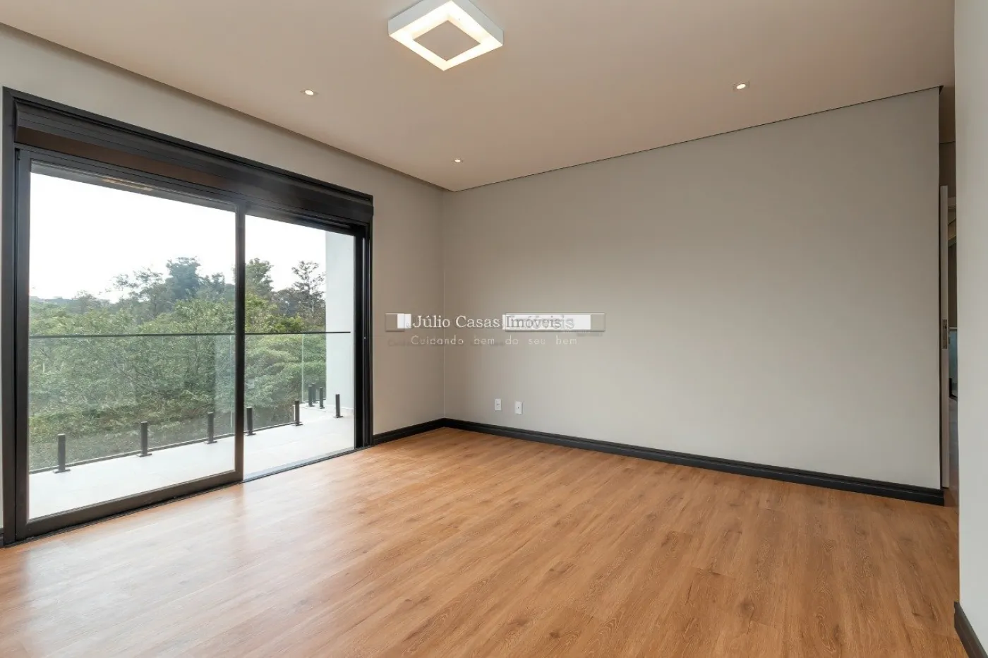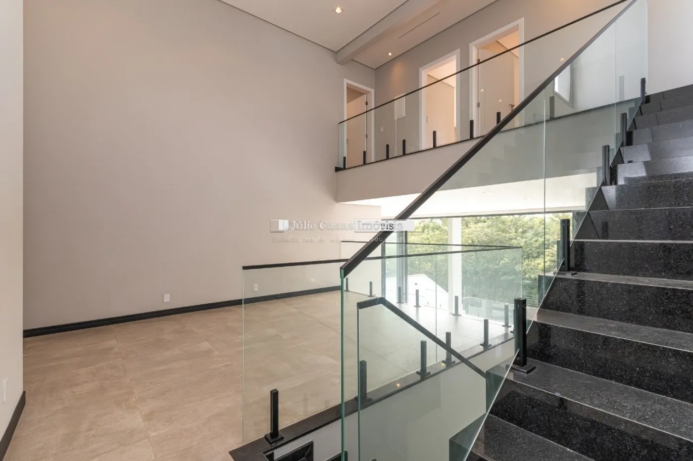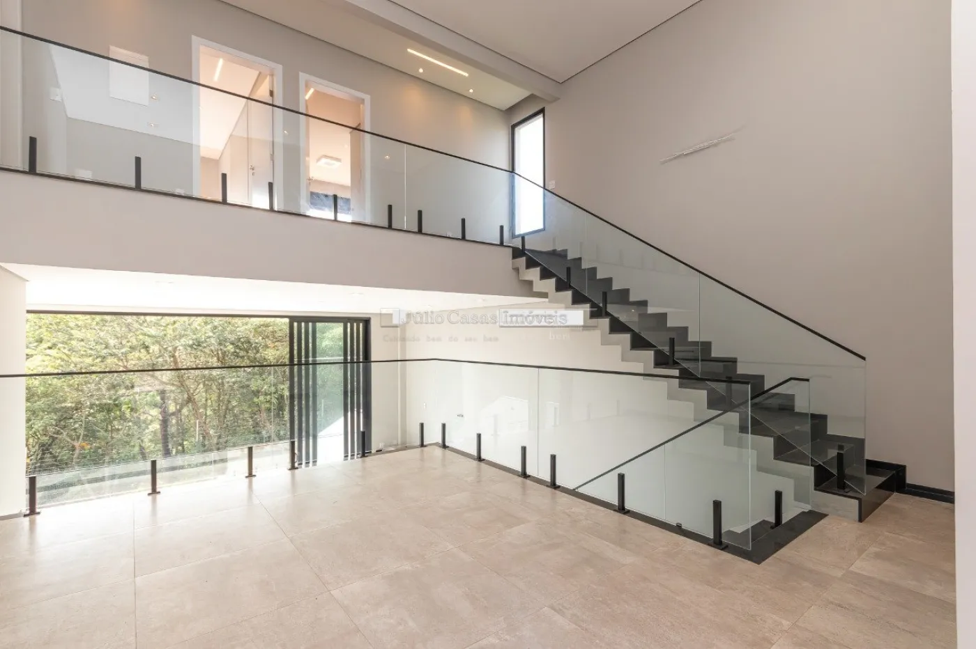 No piso superior, encontram-se três suítes, cada uma com sacada e vista para a área de preservação, garantindo privacidade e tranquilidade. A suíte máster é um verdadeiro destaque, com uma banheira luxuosa e duas cubas, proporcionando um espaço de relaxamento e conforto. Todos os cômodos oferecem vistas panorâmicas para a mata, integrando o ambiente interno com a beleza natural ao redor.