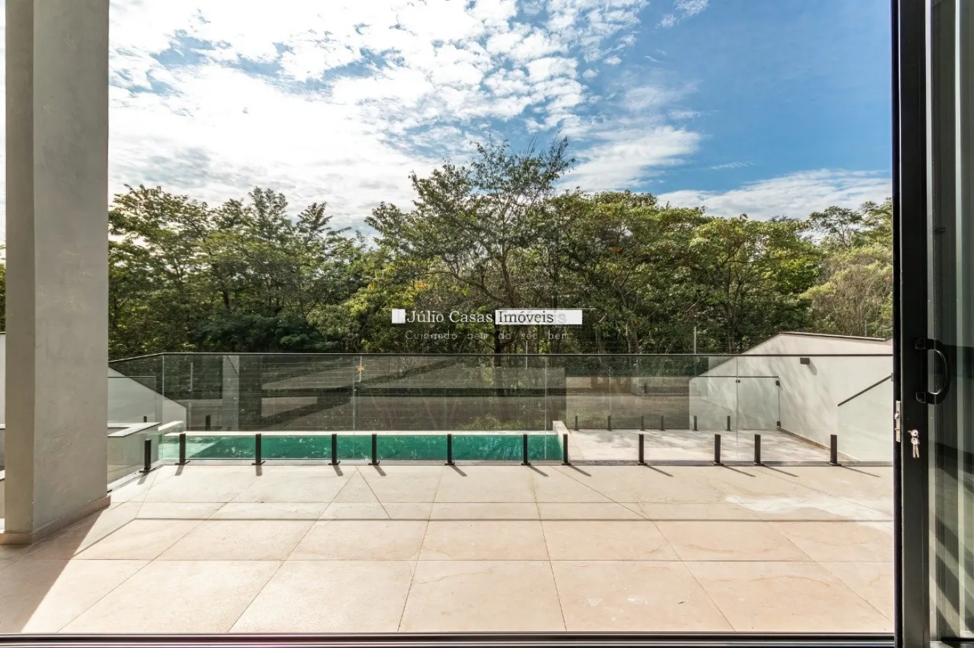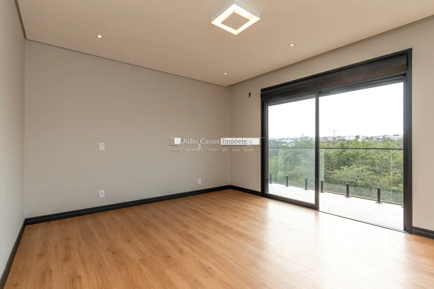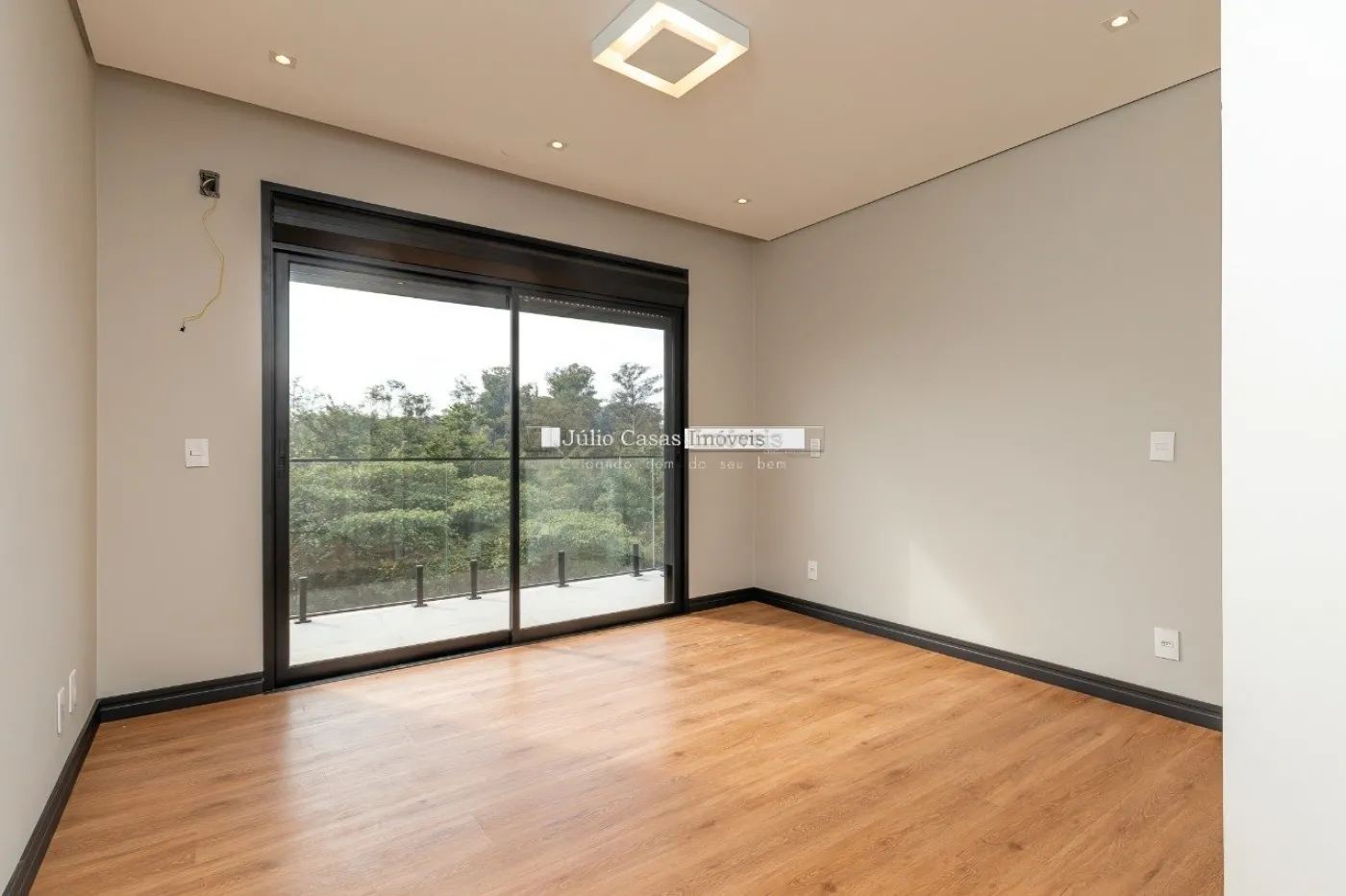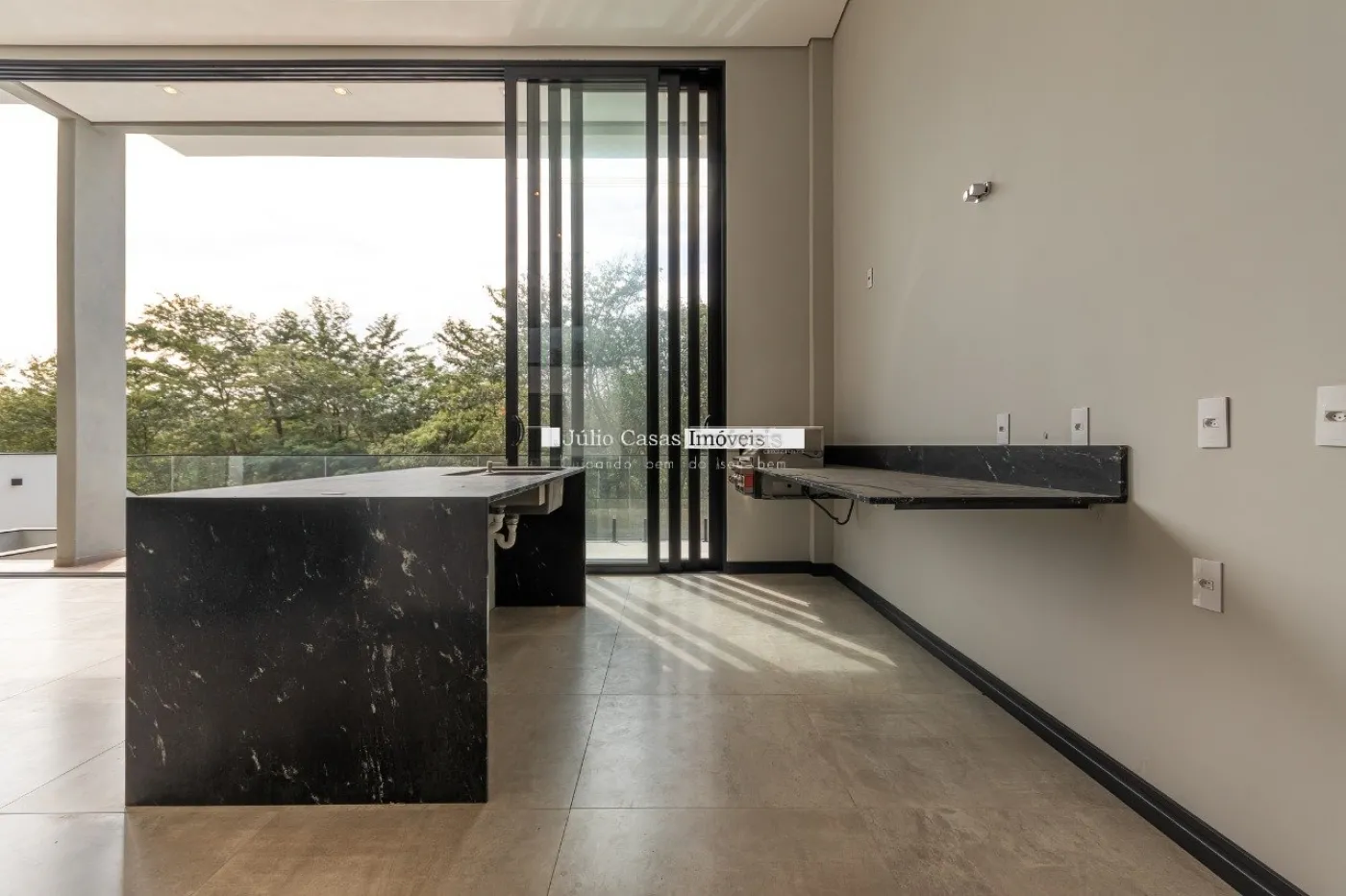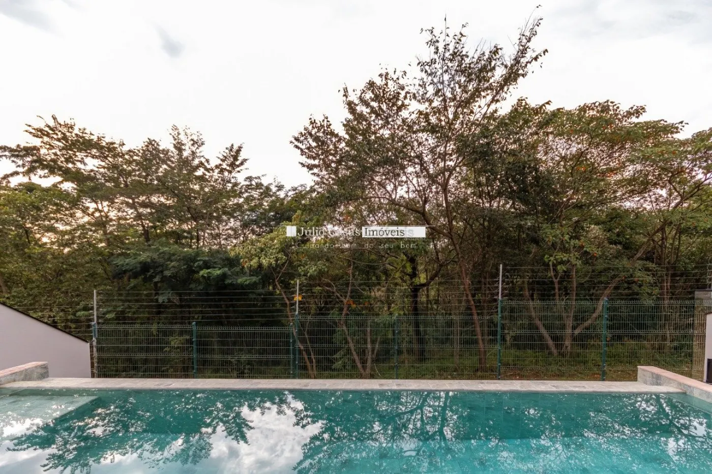 No piso superior, encontram-se três suítes, cada uma com sacada e vista para a área de preservação, garantindo privacidade e tranquilidade. A suíte máster é um verdadeiro destaque, com uma banheira luxuosa e duas cubas, proporcionando um espaço de relaxamento e conforto. Todos os cômodos oferecem vistas panorâmicas para a mata, integrando o ambiente interno com a beleza natural ao redor.