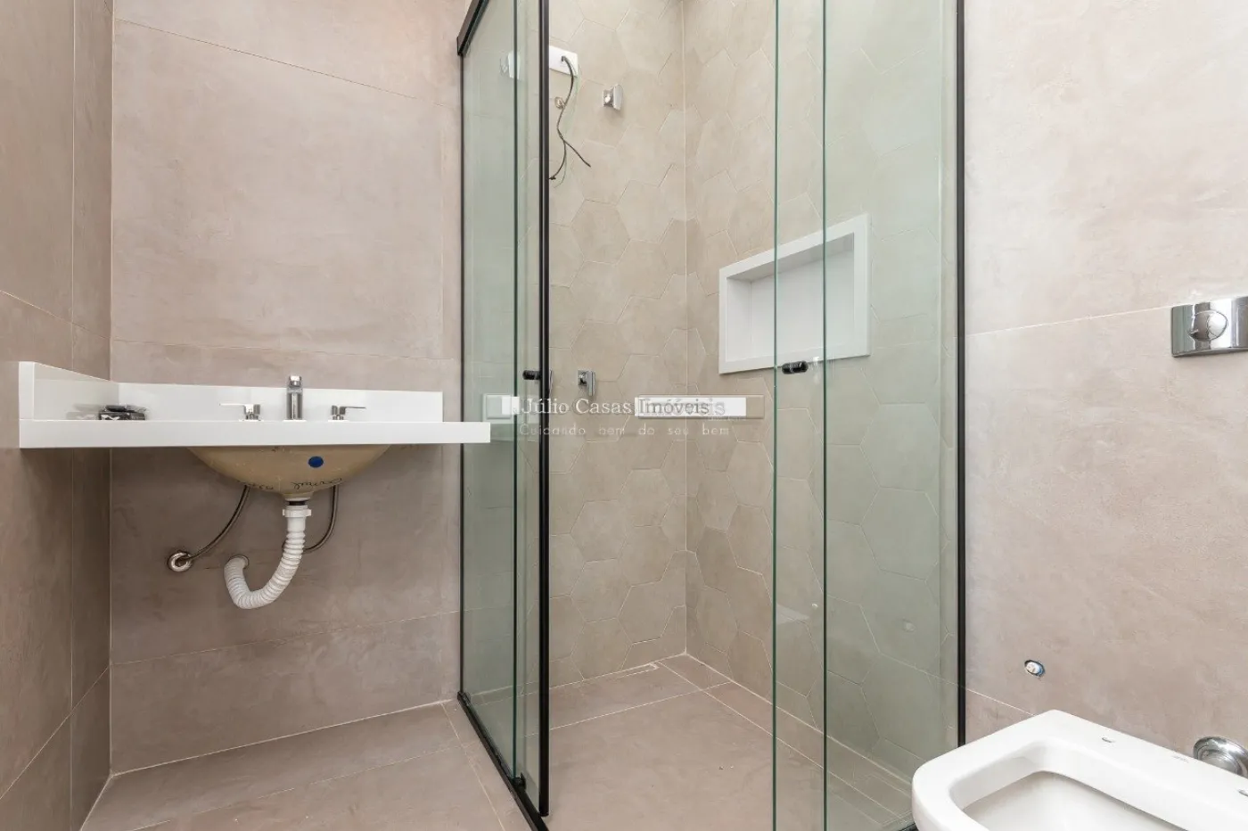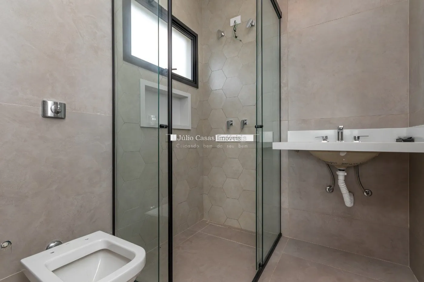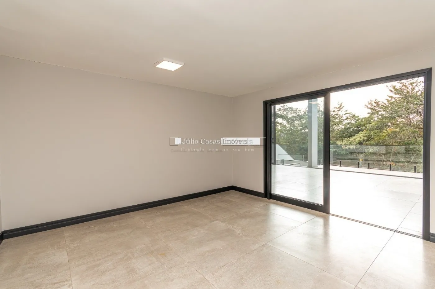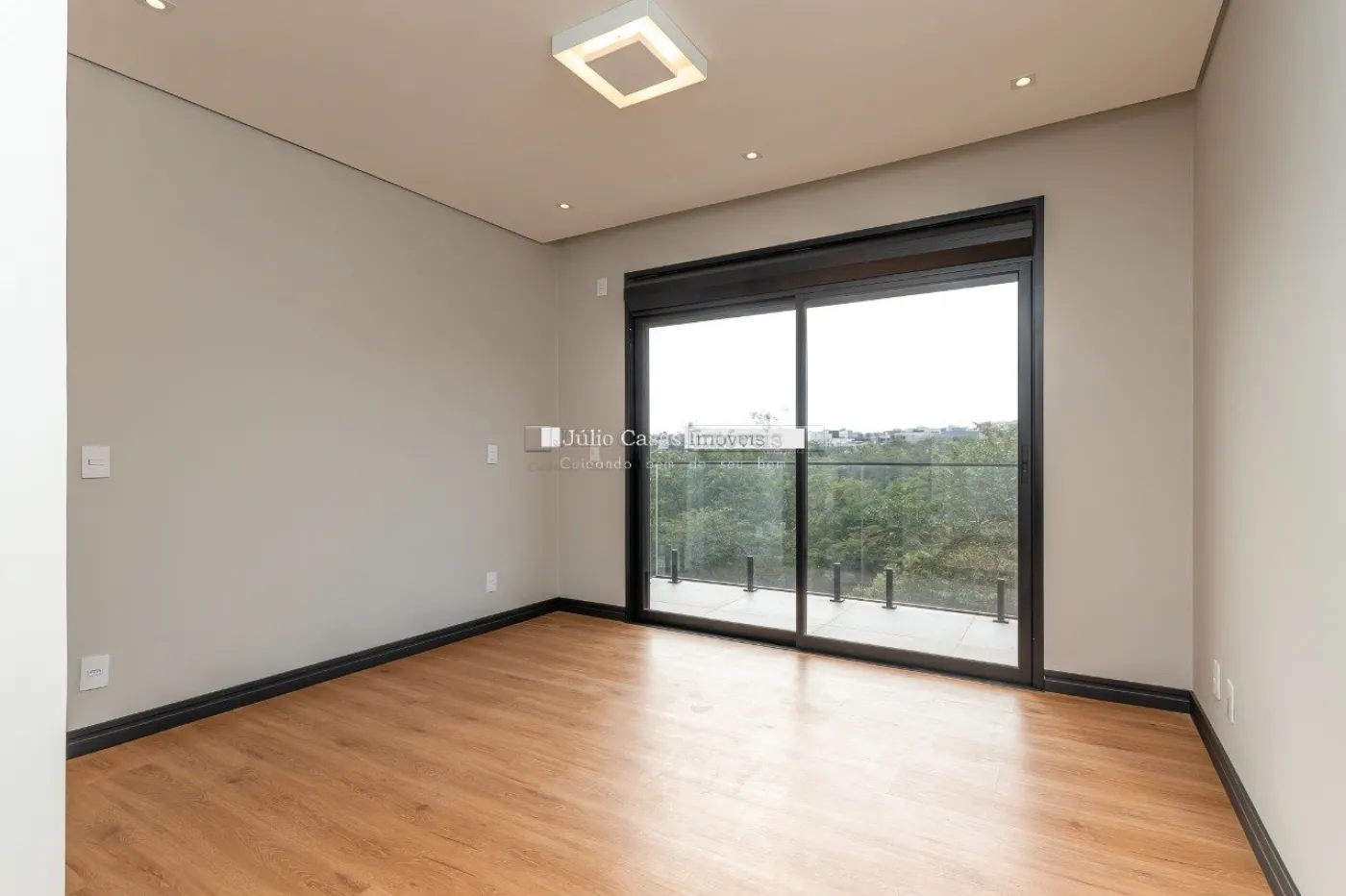 No piso superior, encontram-se três suítes, cada uma com sacada e vista para a área de preservação, garantindo privacidade e tranquilidade. A suíte máster é um verdadeiro destaque, com uma banheira luxuosa e duas cubas, proporcionando um espaço de relaxamento e conforto. Todos os cômodos oferecem vistas panorâmicas para a mata, integrando o ambiente interno com a beleza natural ao redor.