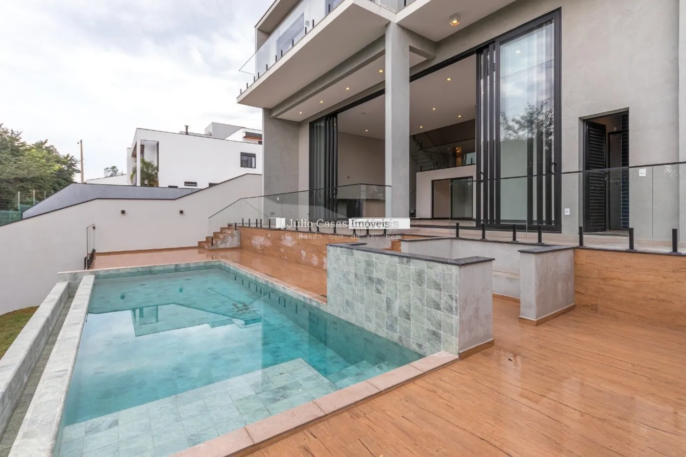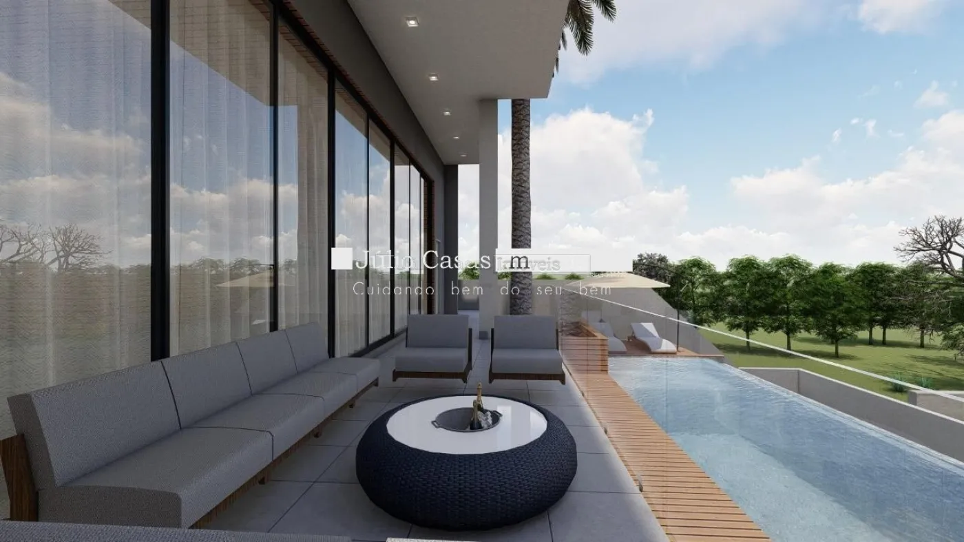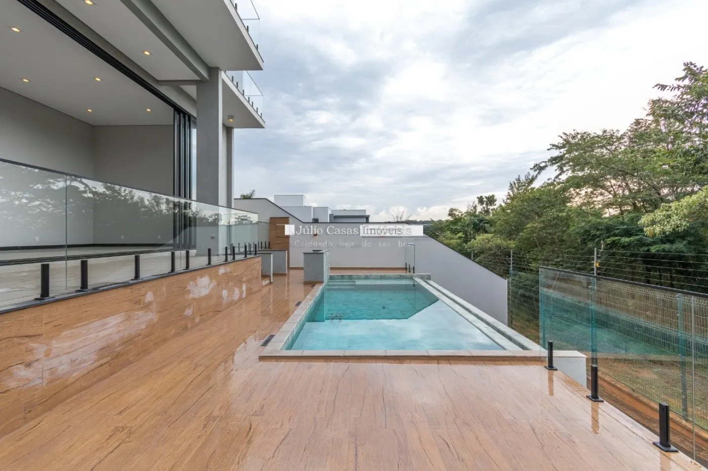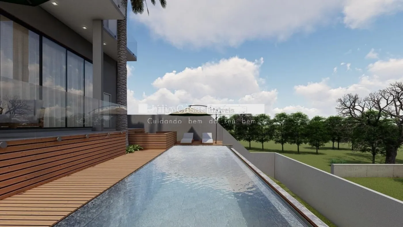 O térreo ainda conta com um escritório, lavabo, lavanderia e um depósito, além de um banheiro dedicado à piscina. A varanda é equipada com uma lareira outdoor (fogo de chão) para momentos de lazer ao ar livre, e a piscina com borda infinita oferece um visual deslumbrante e uma experiência de relaxamento incomparável.