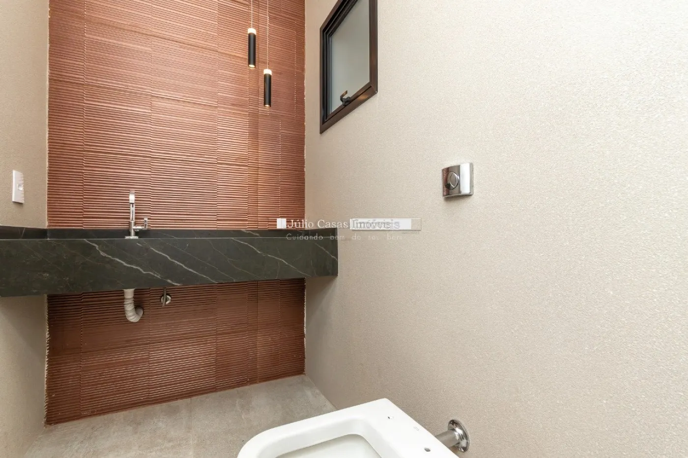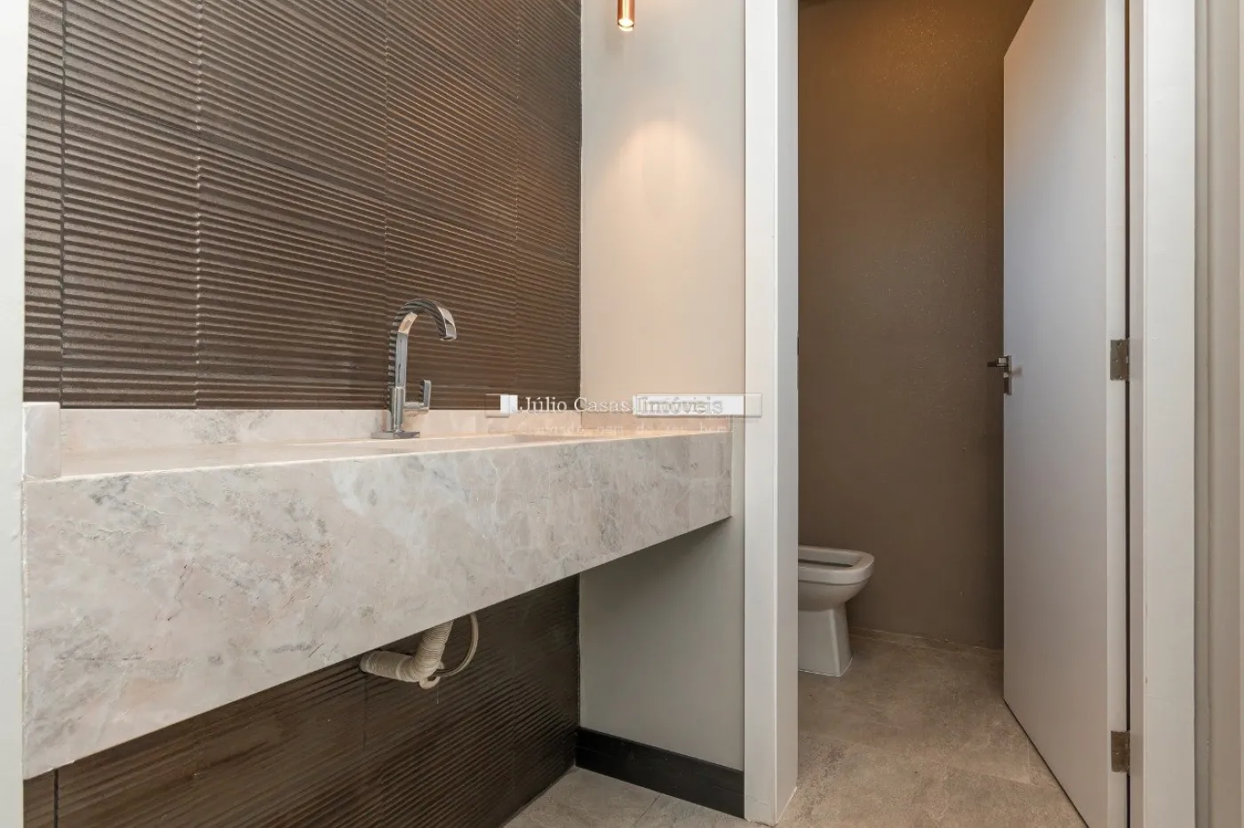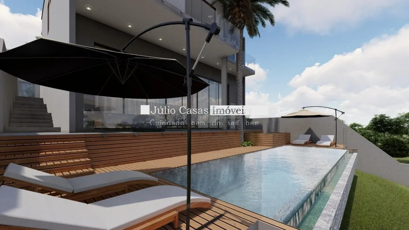 O térreo ainda conta com um escritório, lavabo, lavanderia e um depósito, além de um banheiro dedicado à piscina. A varanda é equipada com uma lareira outdoor (fogo de chão) para momentos de lazer ao ar livre, e a piscina com borda infinita oferece um visual deslumbrante e uma experiência de relaxamento incomparável.
