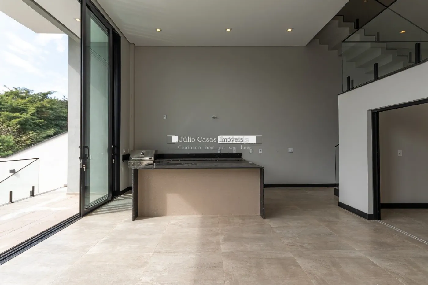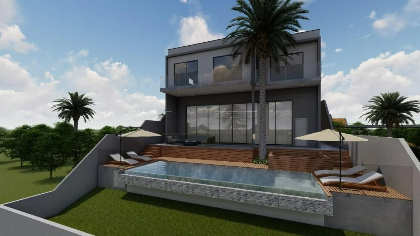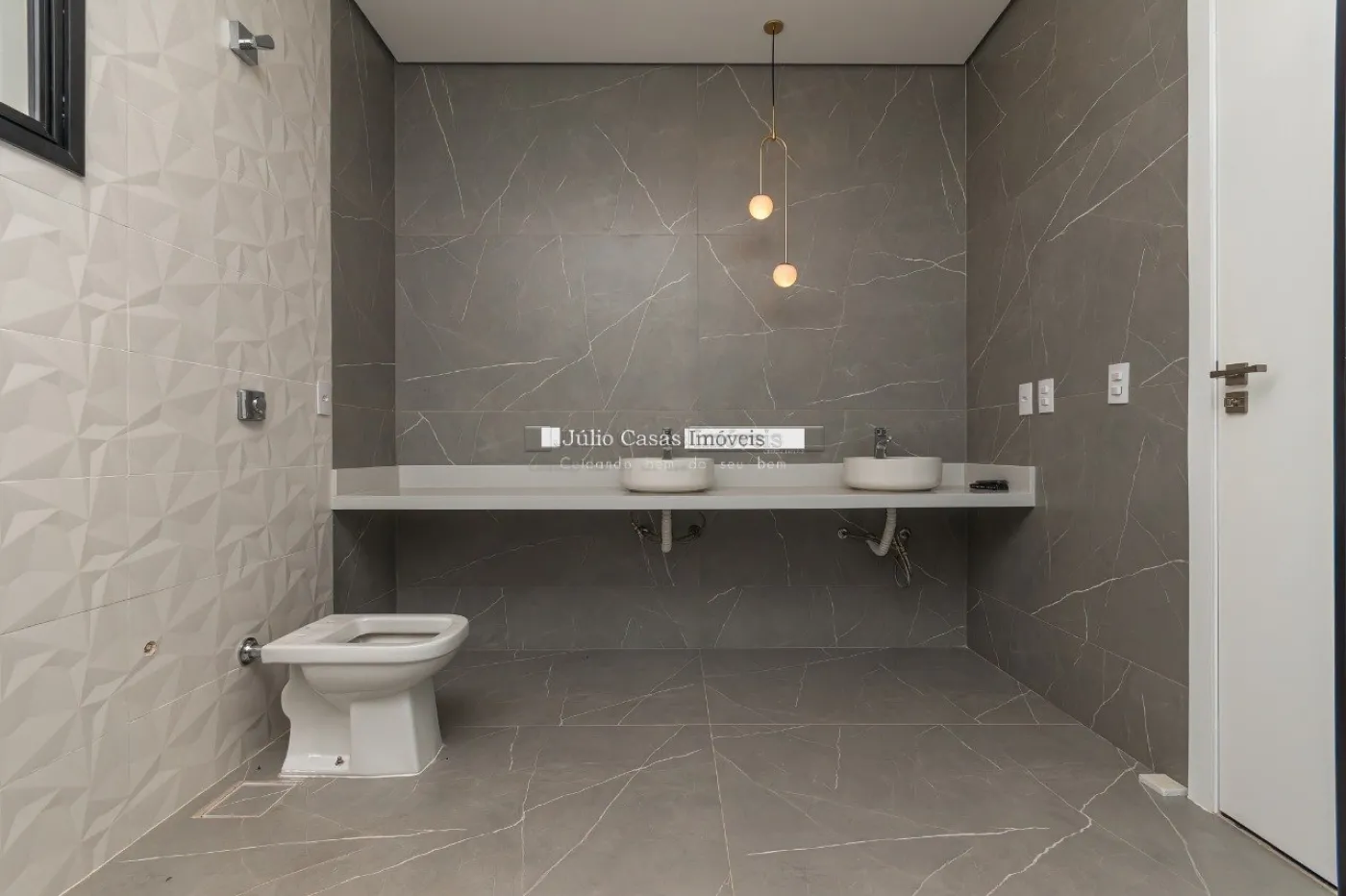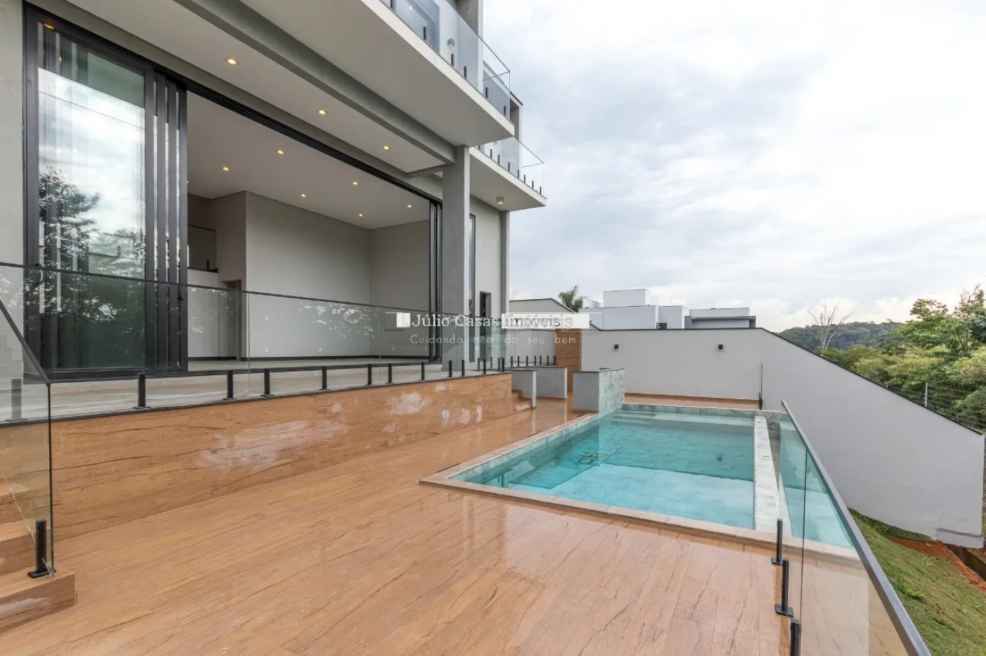 O térreo ainda conta com um escritório, lavabo, lavanderia e um depósito, além de um banheiro dedicado à piscina. A varanda é equipada com uma lareira outdoor (fogo de chão) para momentos de lazer ao ar livre, e a piscina com borda infinita oferece um visual deslumbrante e uma experiência de relaxamento incomparável.