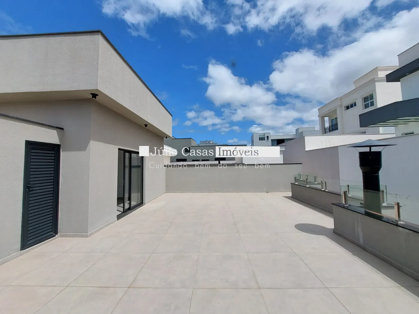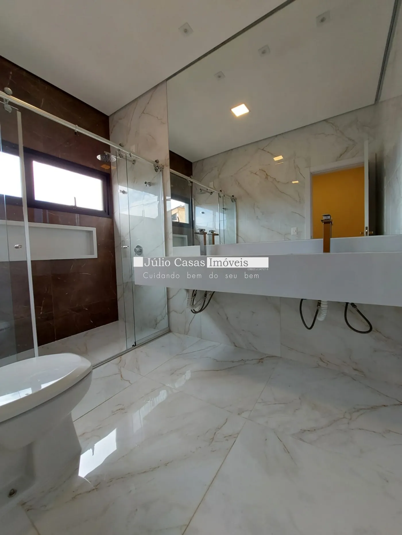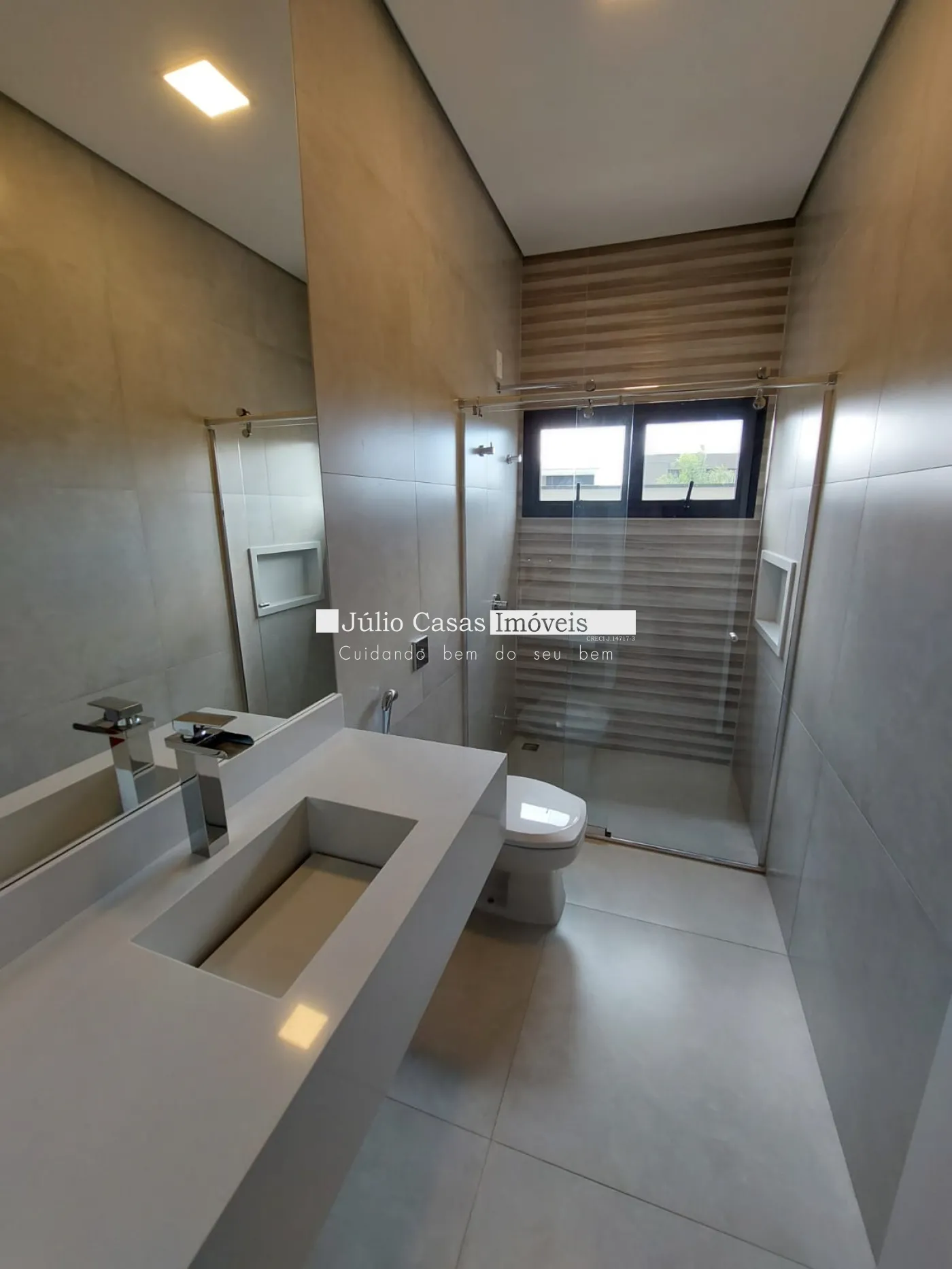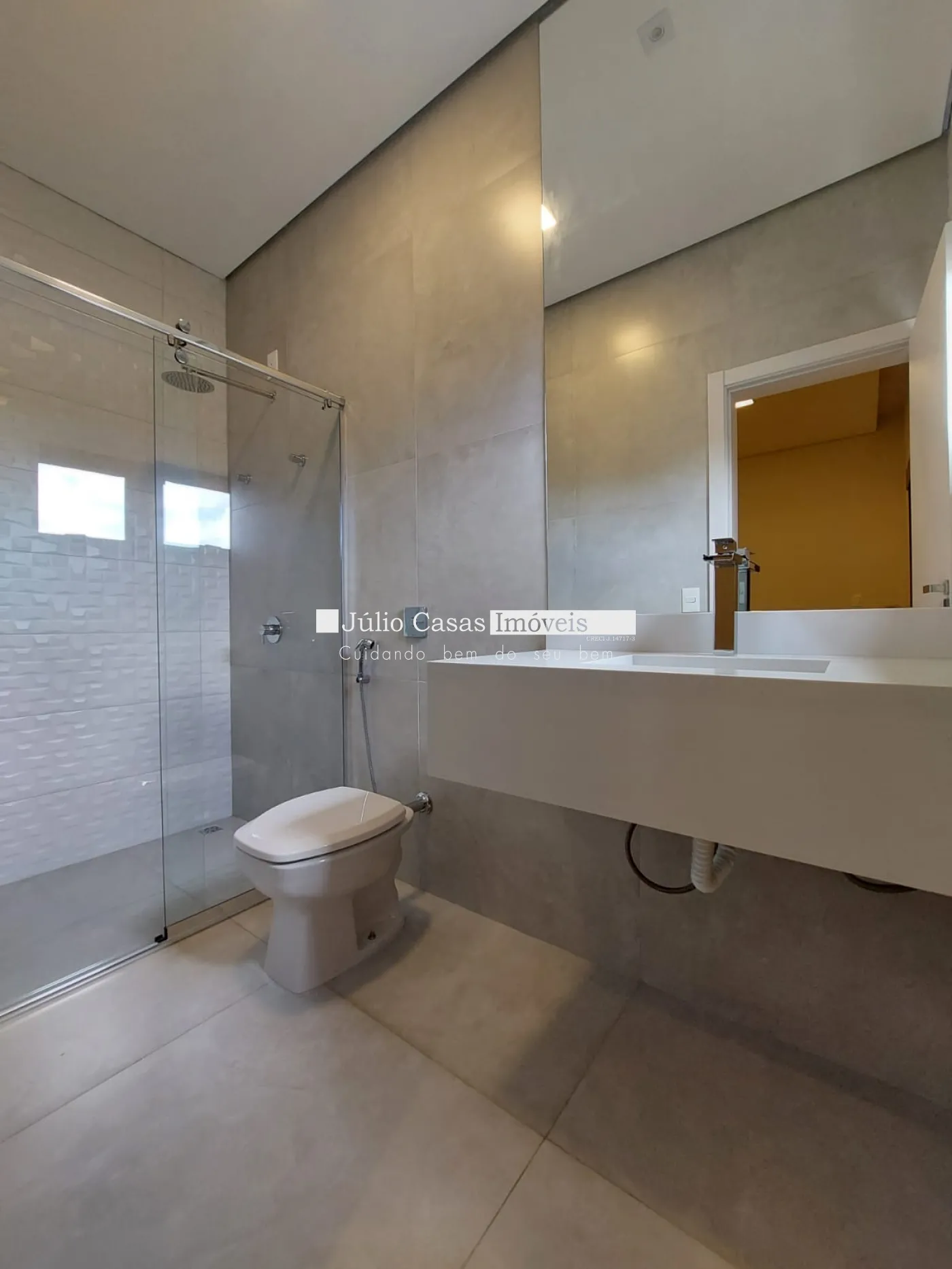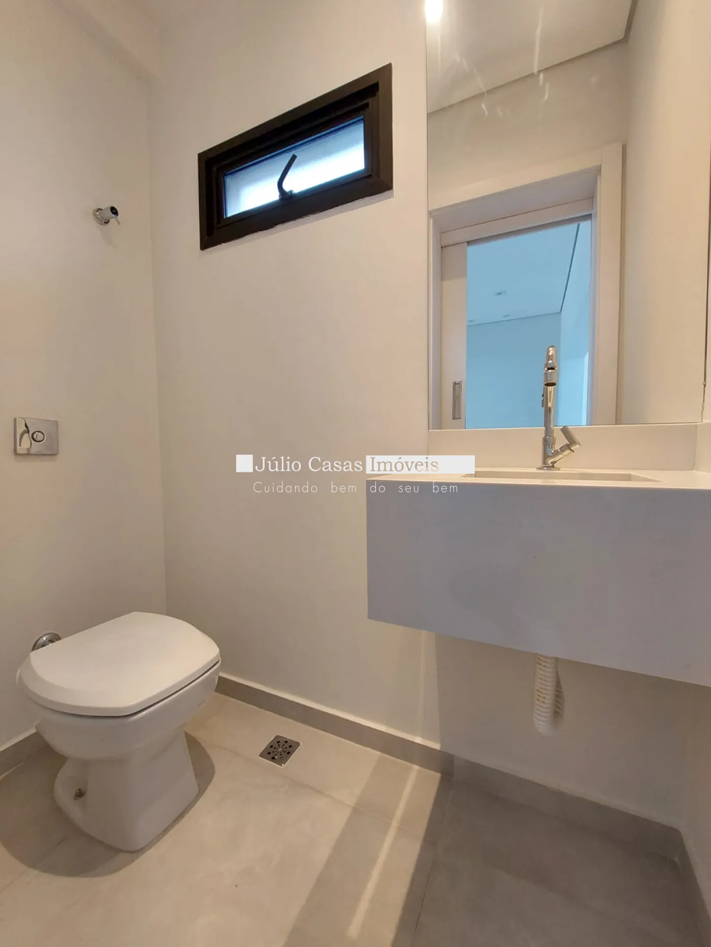 O imóvel possui 3 suítes amplas, todas com piso vinílico. Os banheiros são revestidos em porcelanato e contam com espelhos, boxes, pias esculpidas e aquecimento nas torneiras e duchas. Há também área de serviço e um depósito externo.