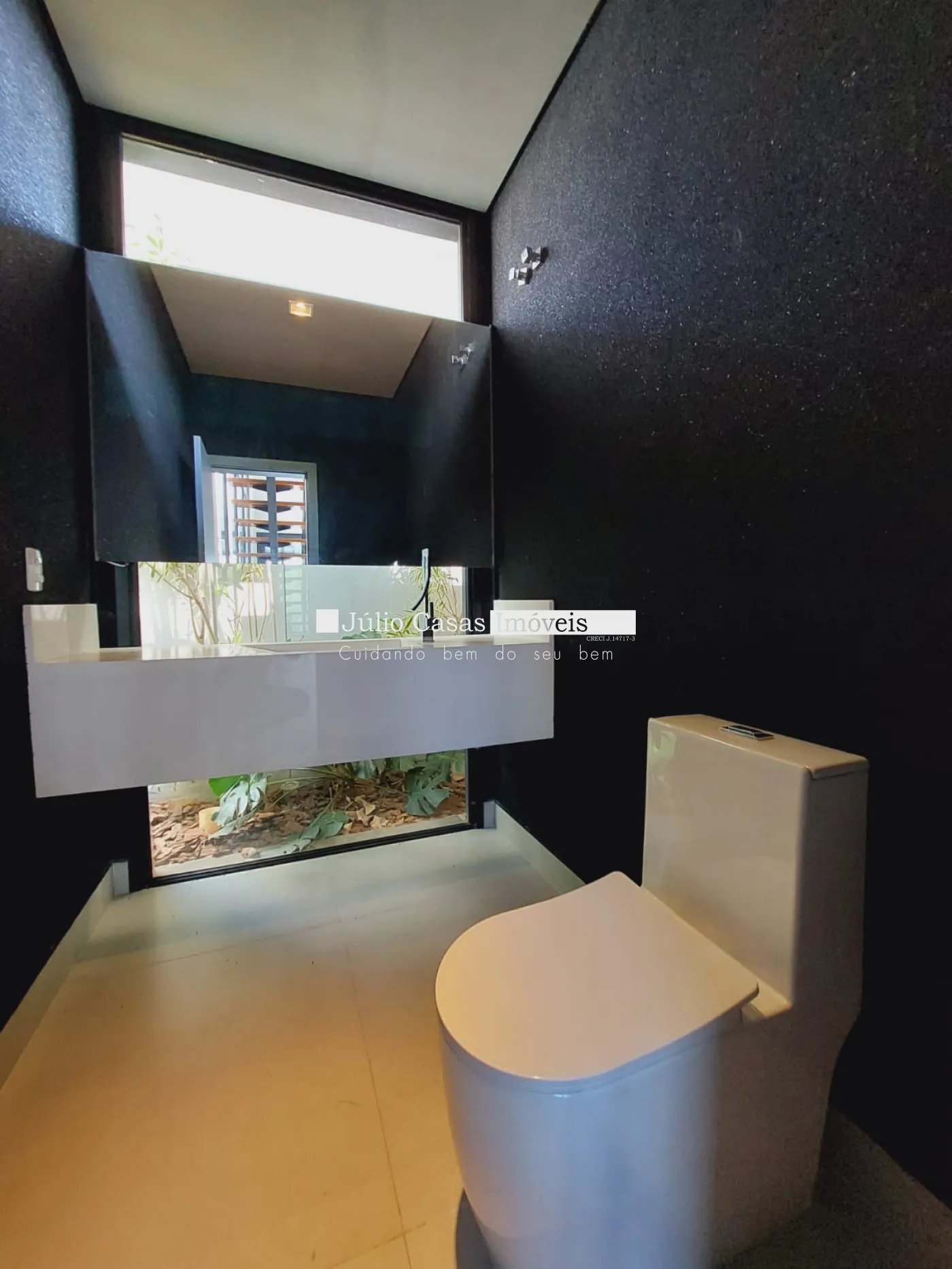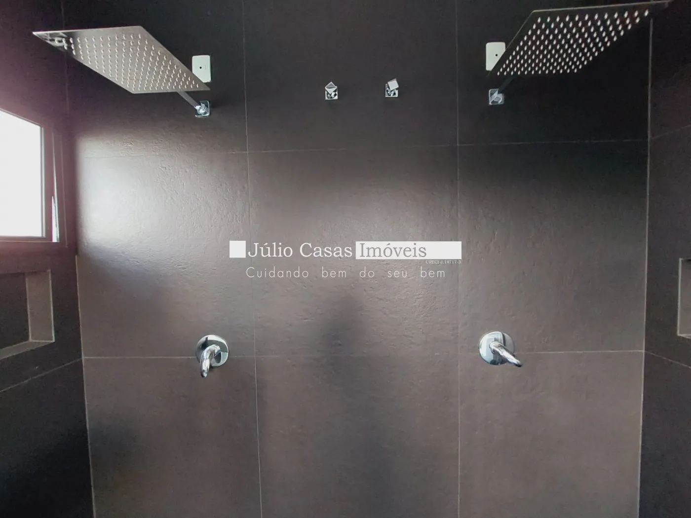 Sobrado com sala de estar e jantar com pé direito alto, cozinha ampla, área gourmet, despensa, lavanderia ampla, quarto de despejo, wc externo para suporte da piscina.
