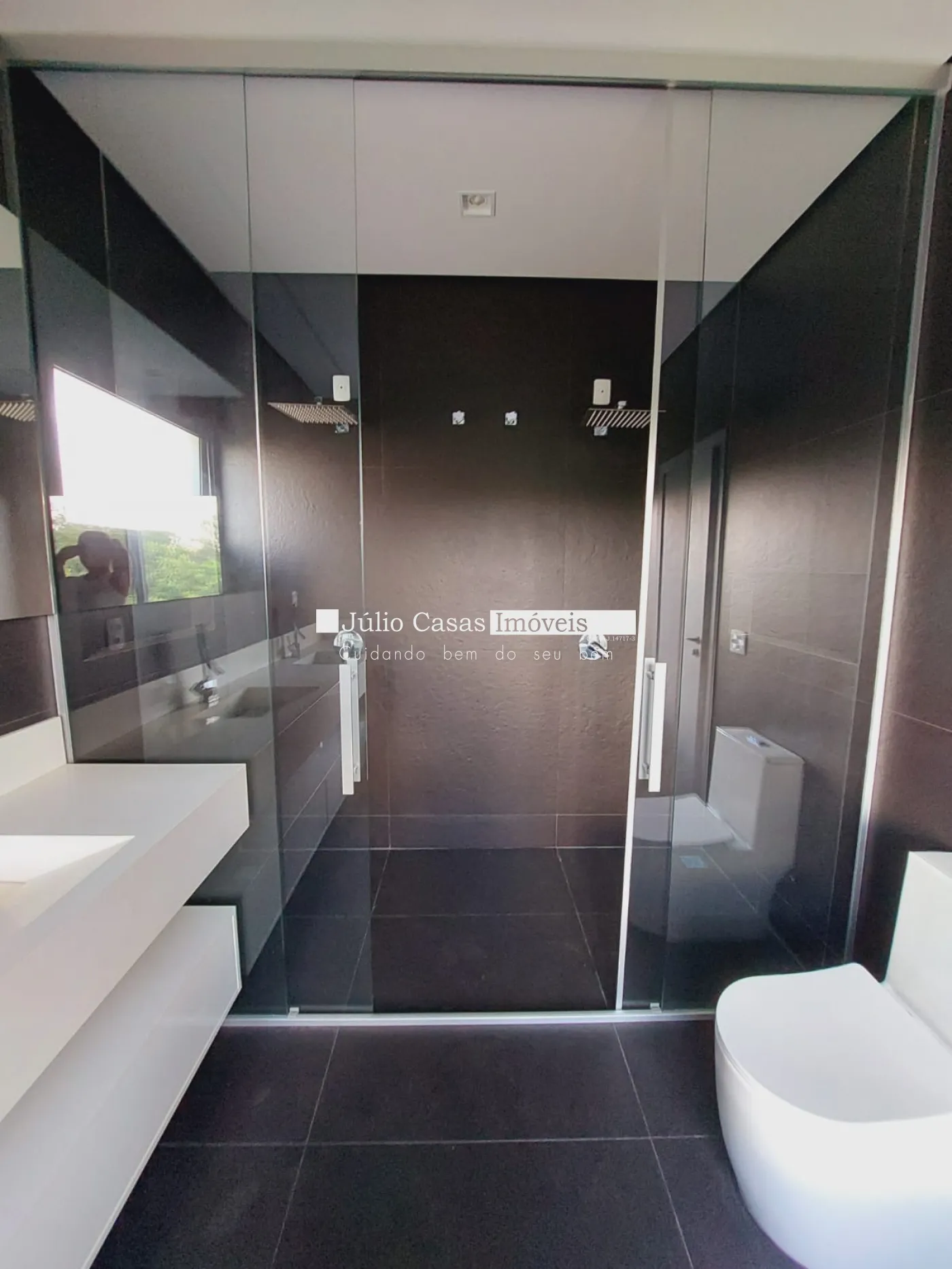 wc com box em vidro até o teto, janelas com persianas automatizadas, espelhos com iluminação em LED.