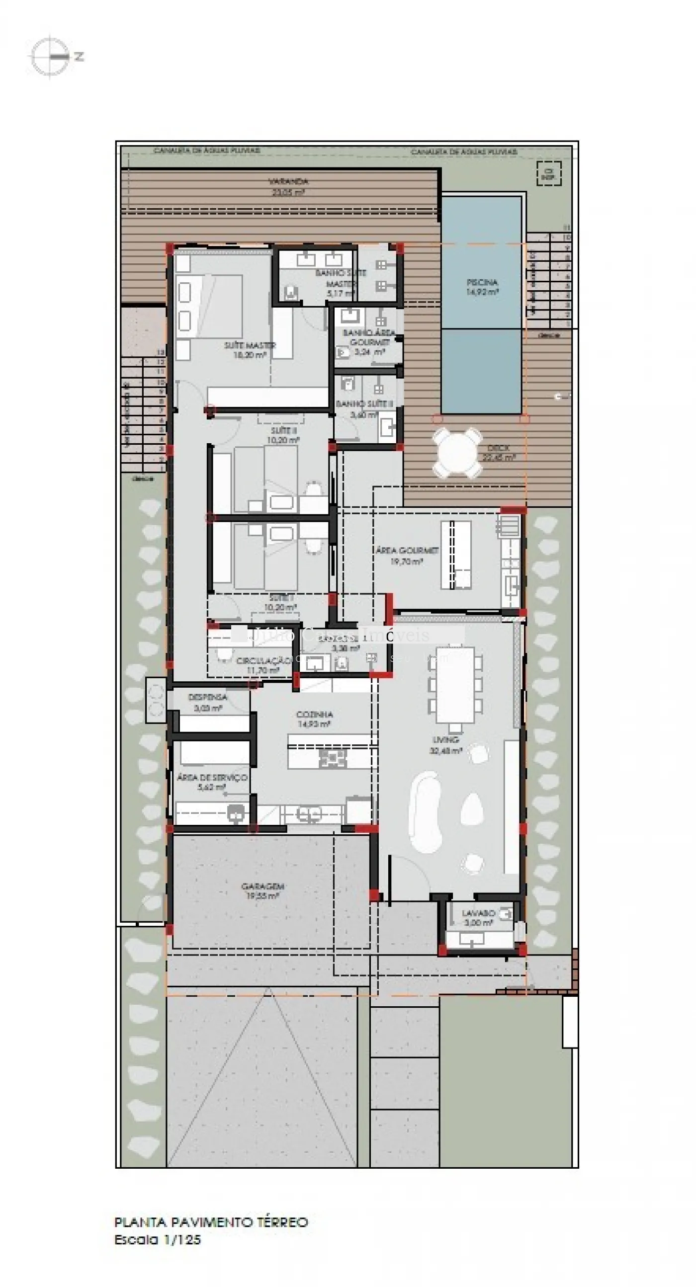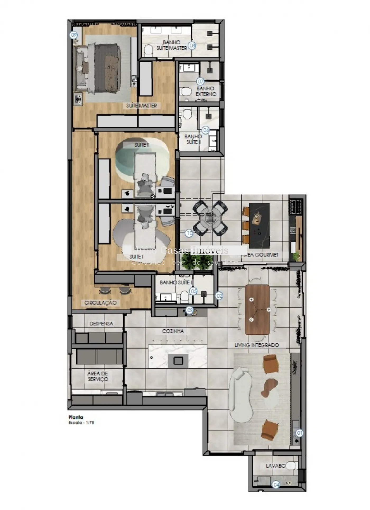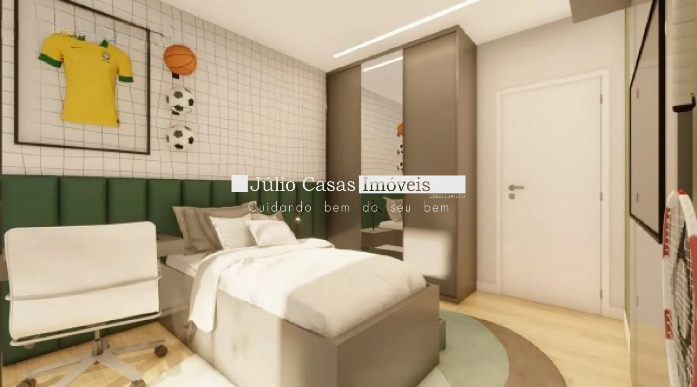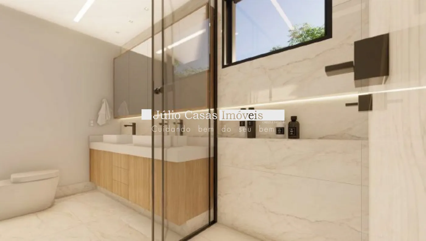 A residência conta com área de serviço planejada, três suítes (sendo uma master) e um prático escritório. Todos os ambientes serão entregues com armários modulados de alto padrão, garantindo praticidade, conforto e acabamento de excelência.