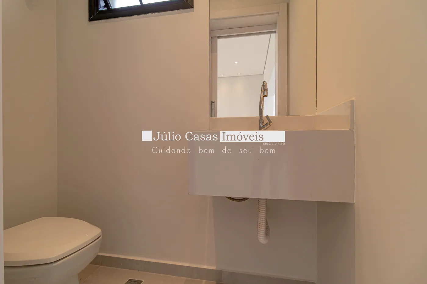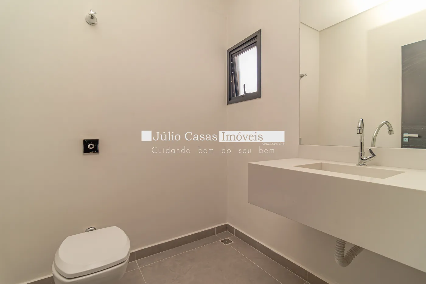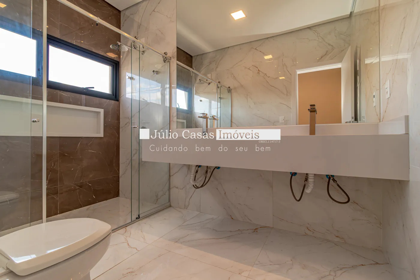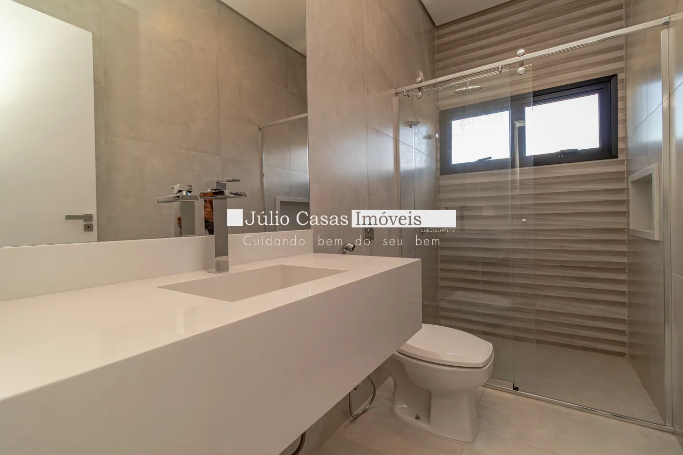 Os banheiros contam com porcelanatos de alto padrão, espelhos, boxes, pias esculpidas com aquecimento nas torneiras e chuveiros, além de esquadrias em alumínio na cor preta.