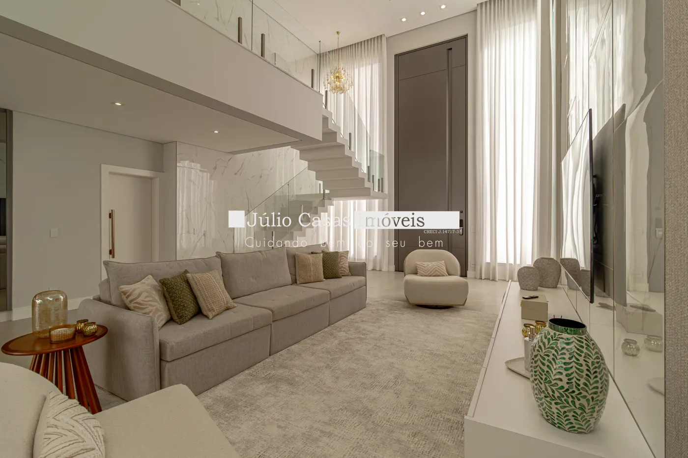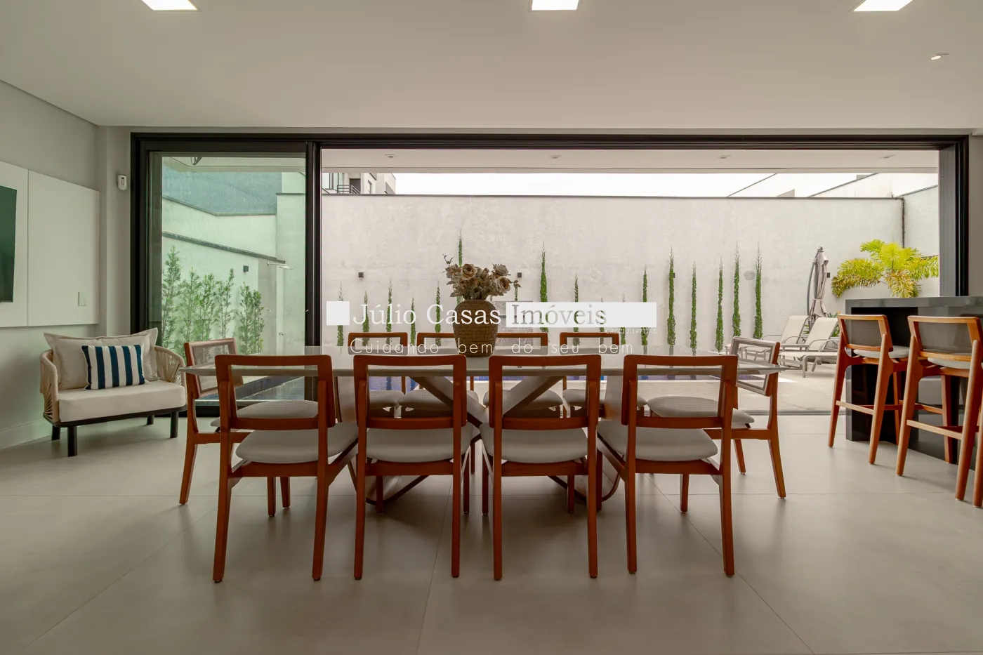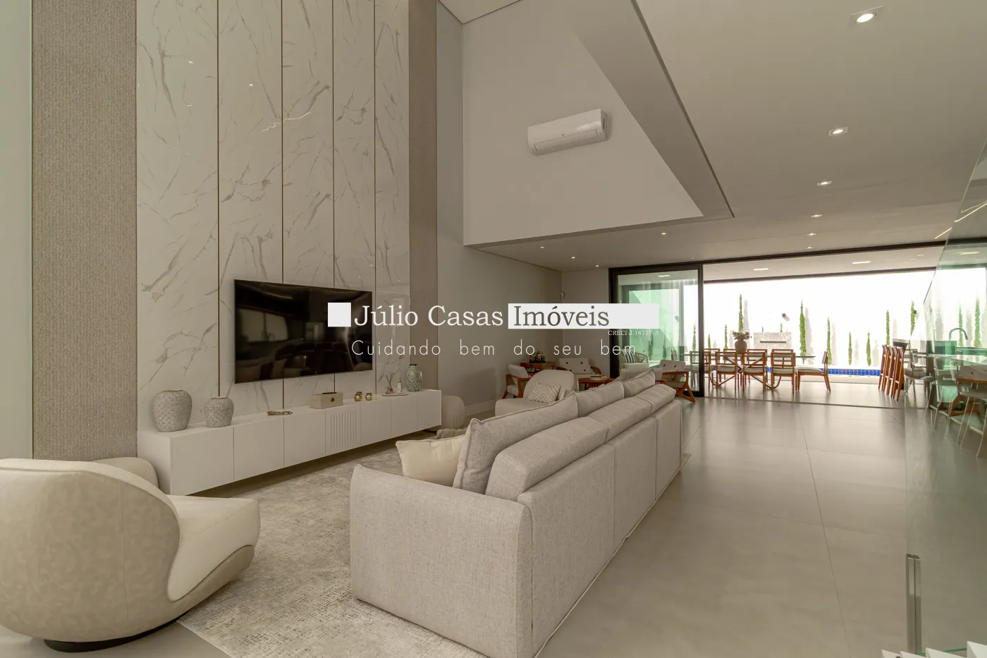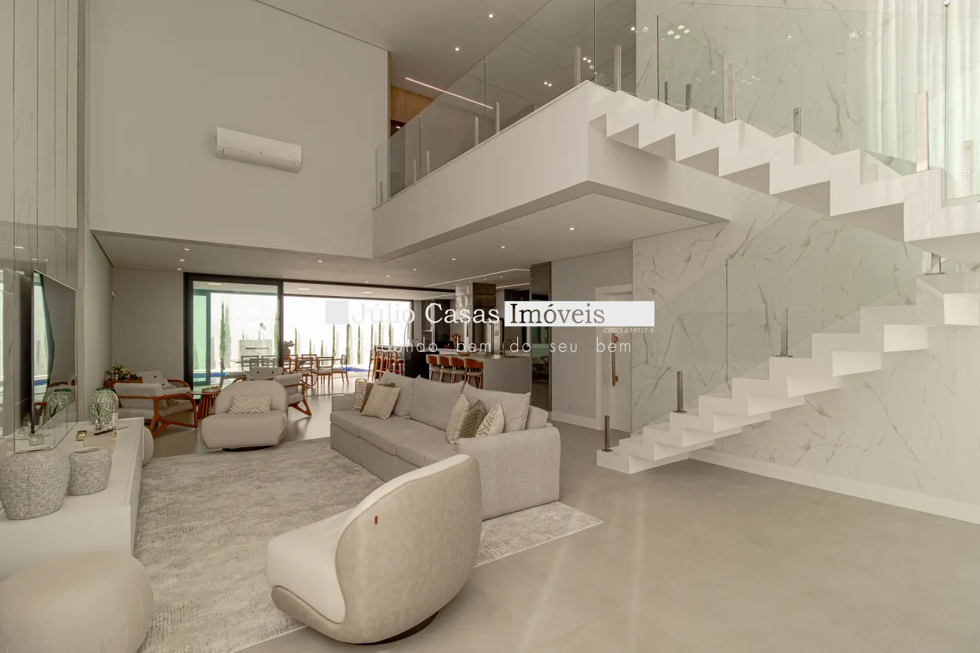 Logo na entrada, a casa revela sua proposta: uma área social totalmente integrada, com pé-direito imponente de 6,5 metros, que proporciona amplitude, sofisticação e excelente iluminação natural. Todo o ambiente é climatizado e convida tanto ao convívio diário quanto a momentos especiais com amigos e família.
