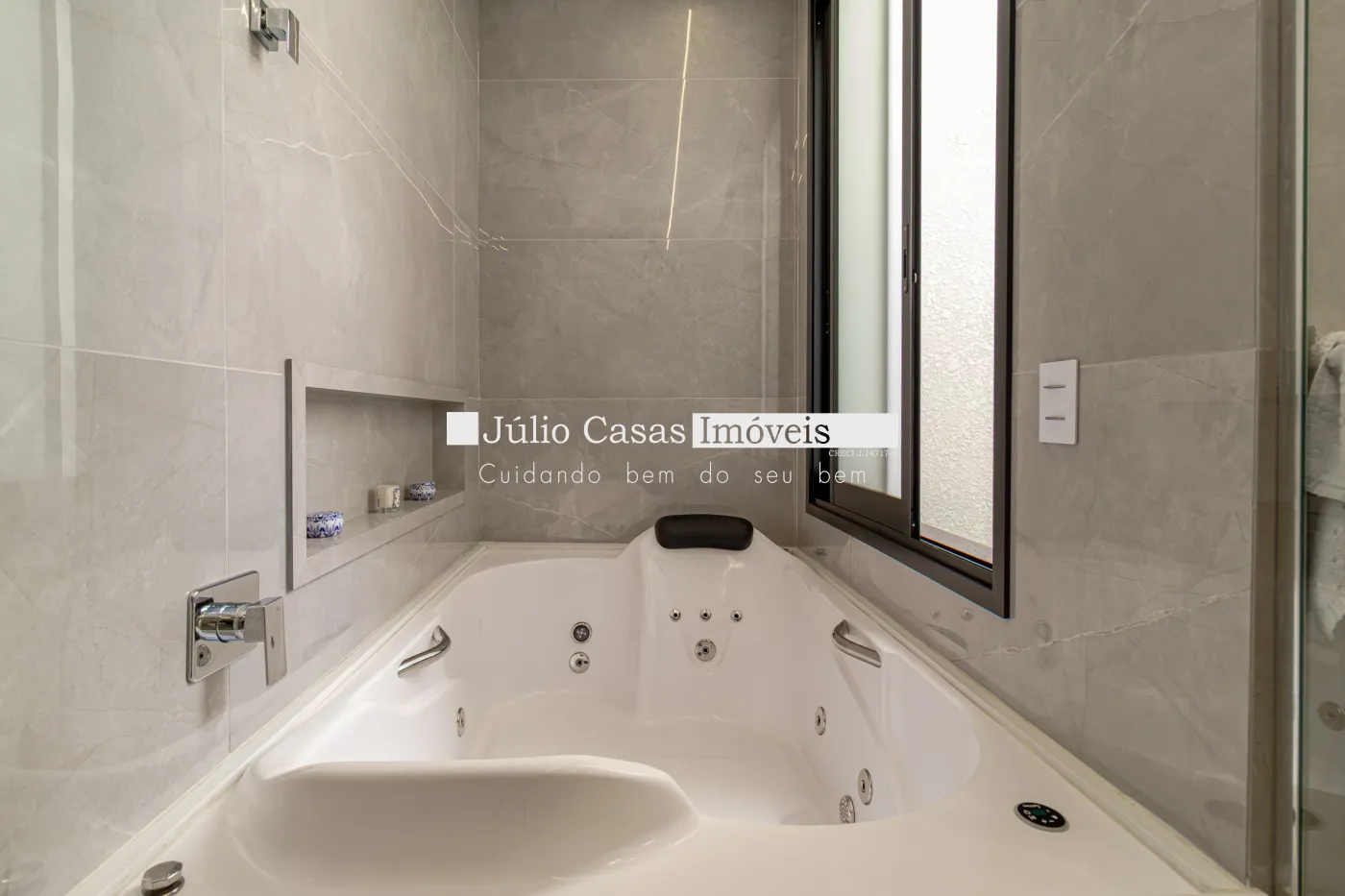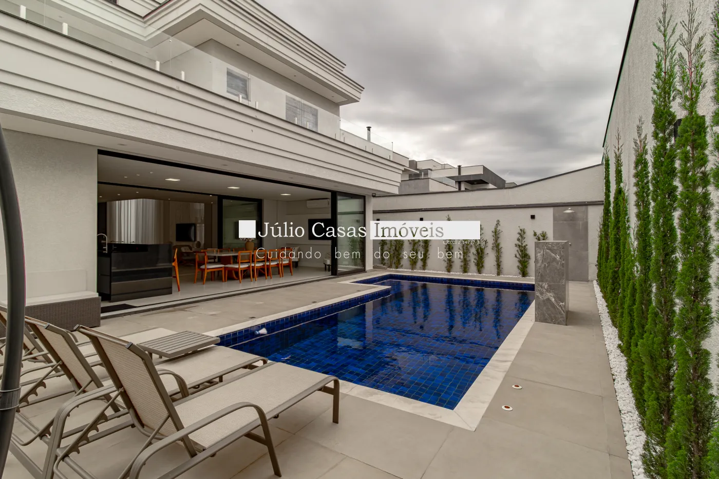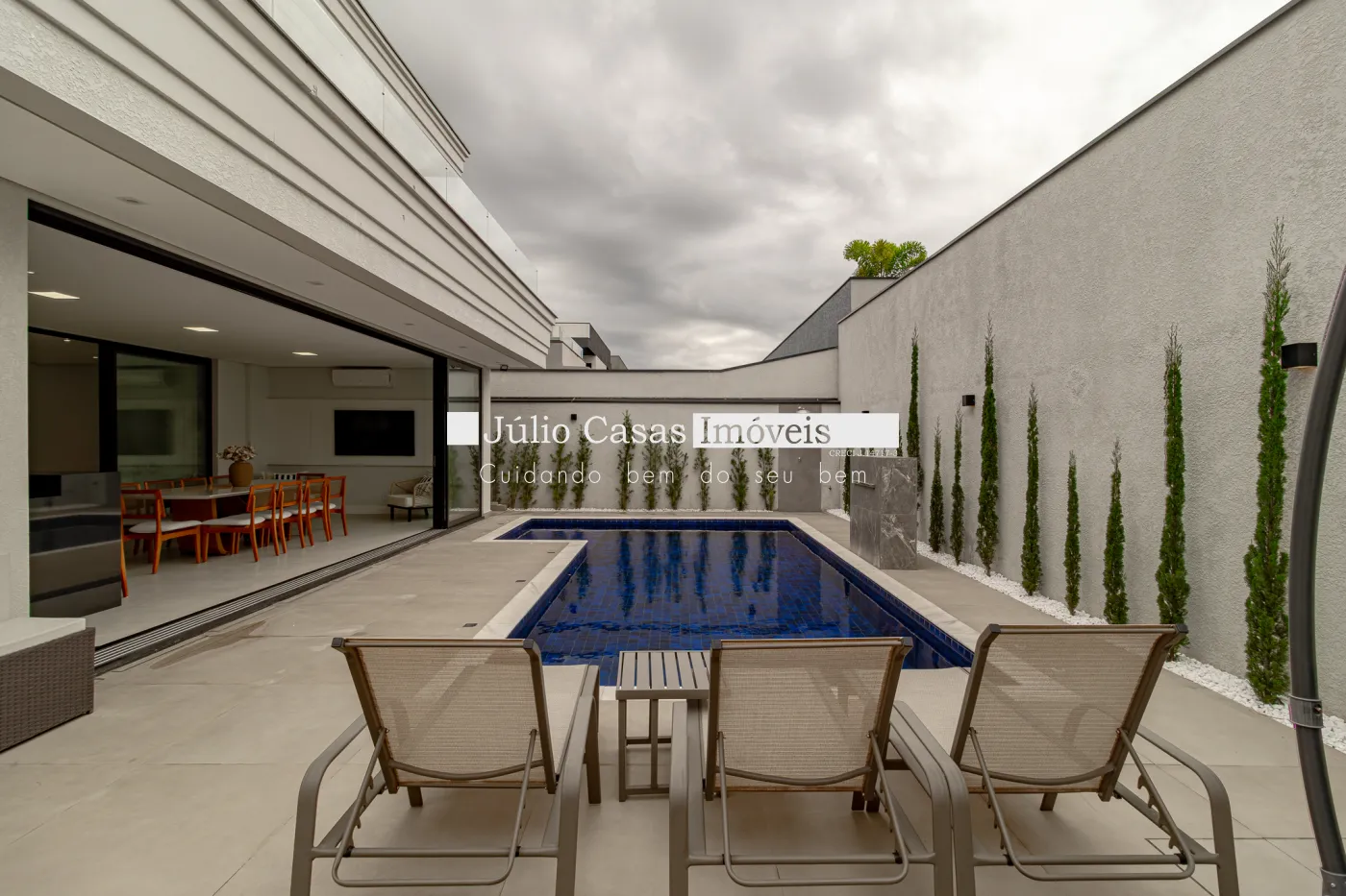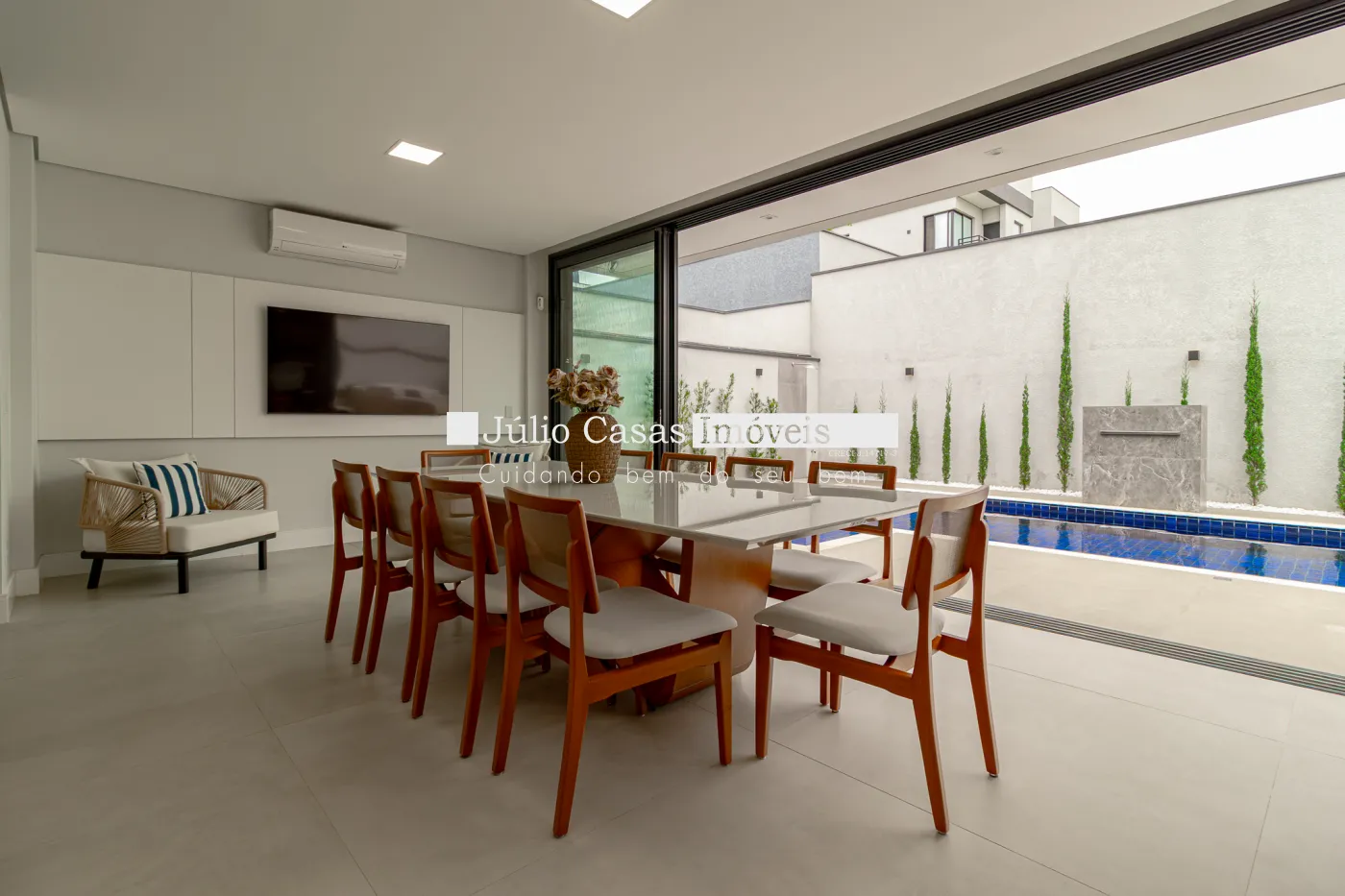 A área externa complementa a experiência de morar bem, com uma piscina de 8 x 4 metros, equipada com hidromassagem e cascata, criando um verdadeiro refúgio particular dentro de casa.
