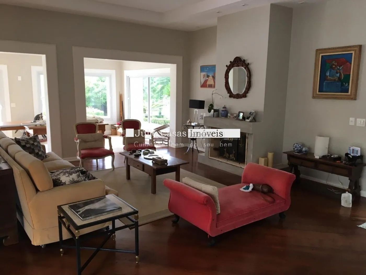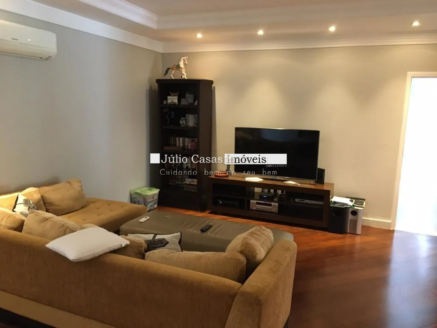 Belíssima casa térrea com 4 salas: sala de jantar, sala de TV, sala de estar com lareira e home theater em piso de madeira com acabamento em gesso, luminárias em LED. Sala de jantar com piso revestido em porcelanato com bordas de madeira.
