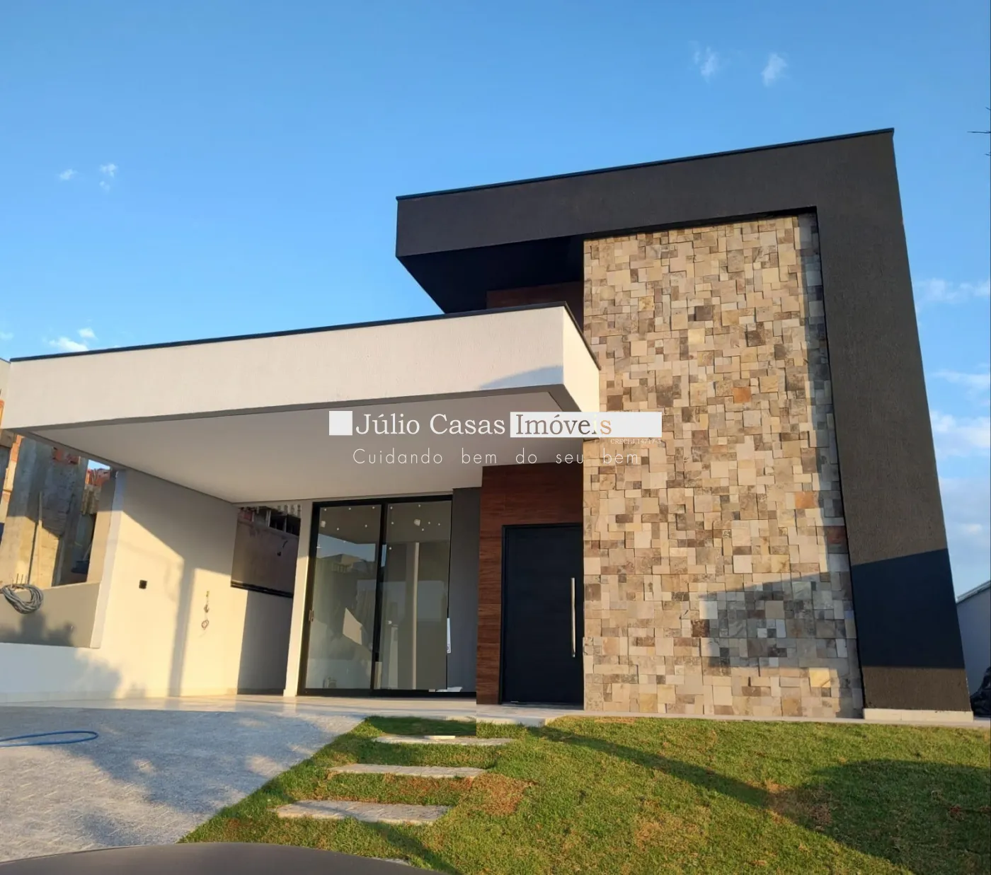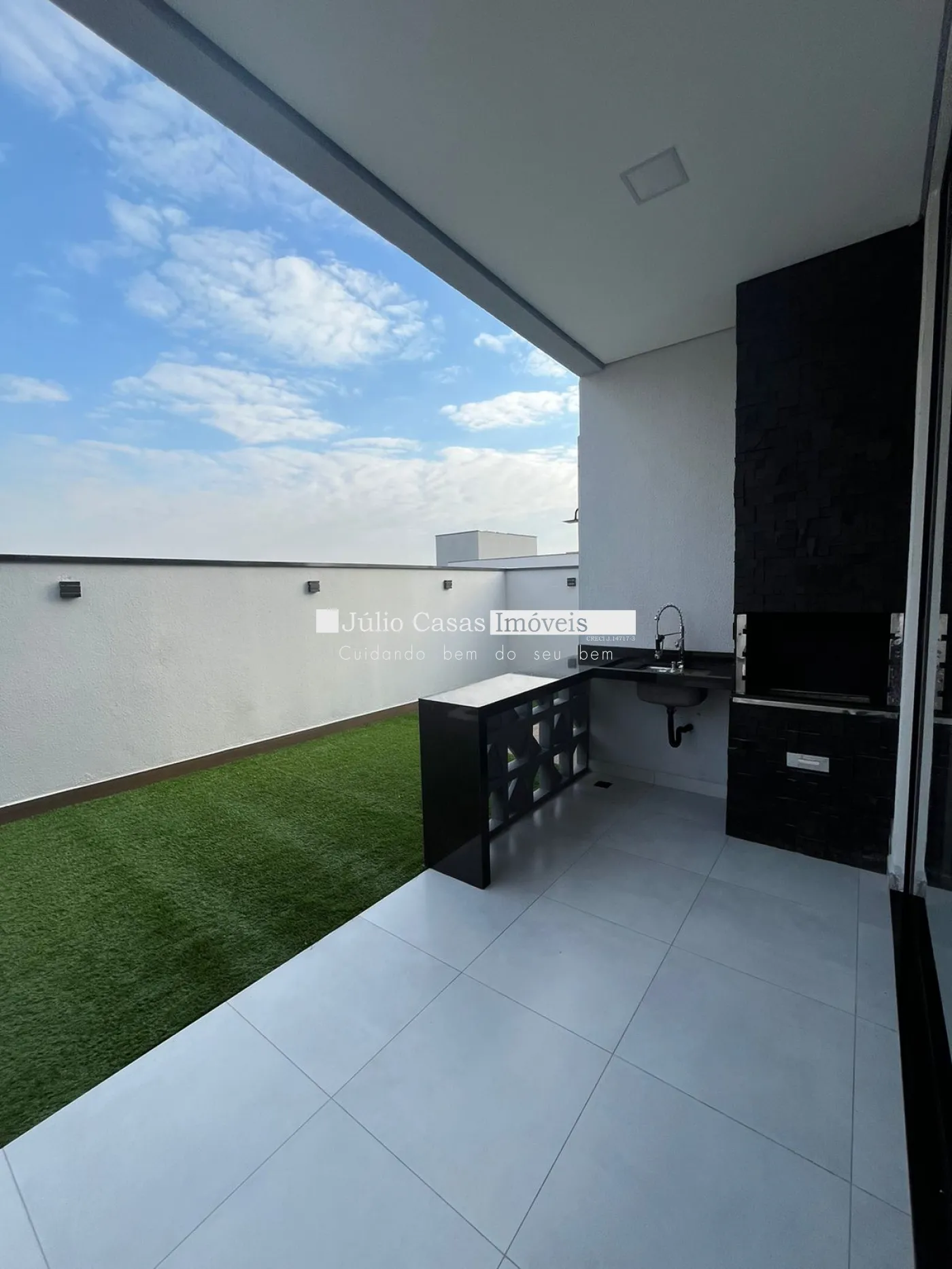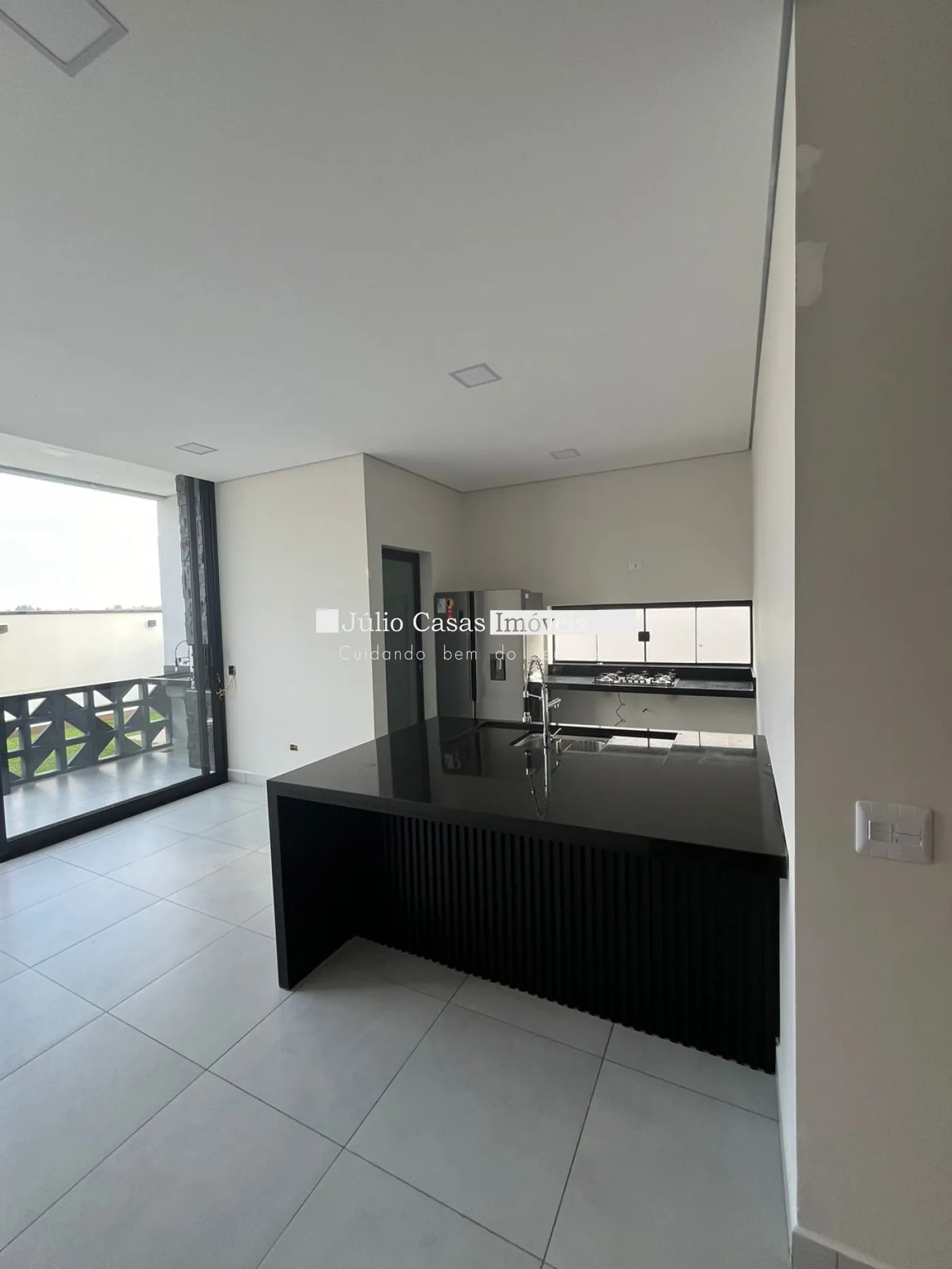 Acabamentos em granito São Gabriel e esquadrias de alumínio preto.