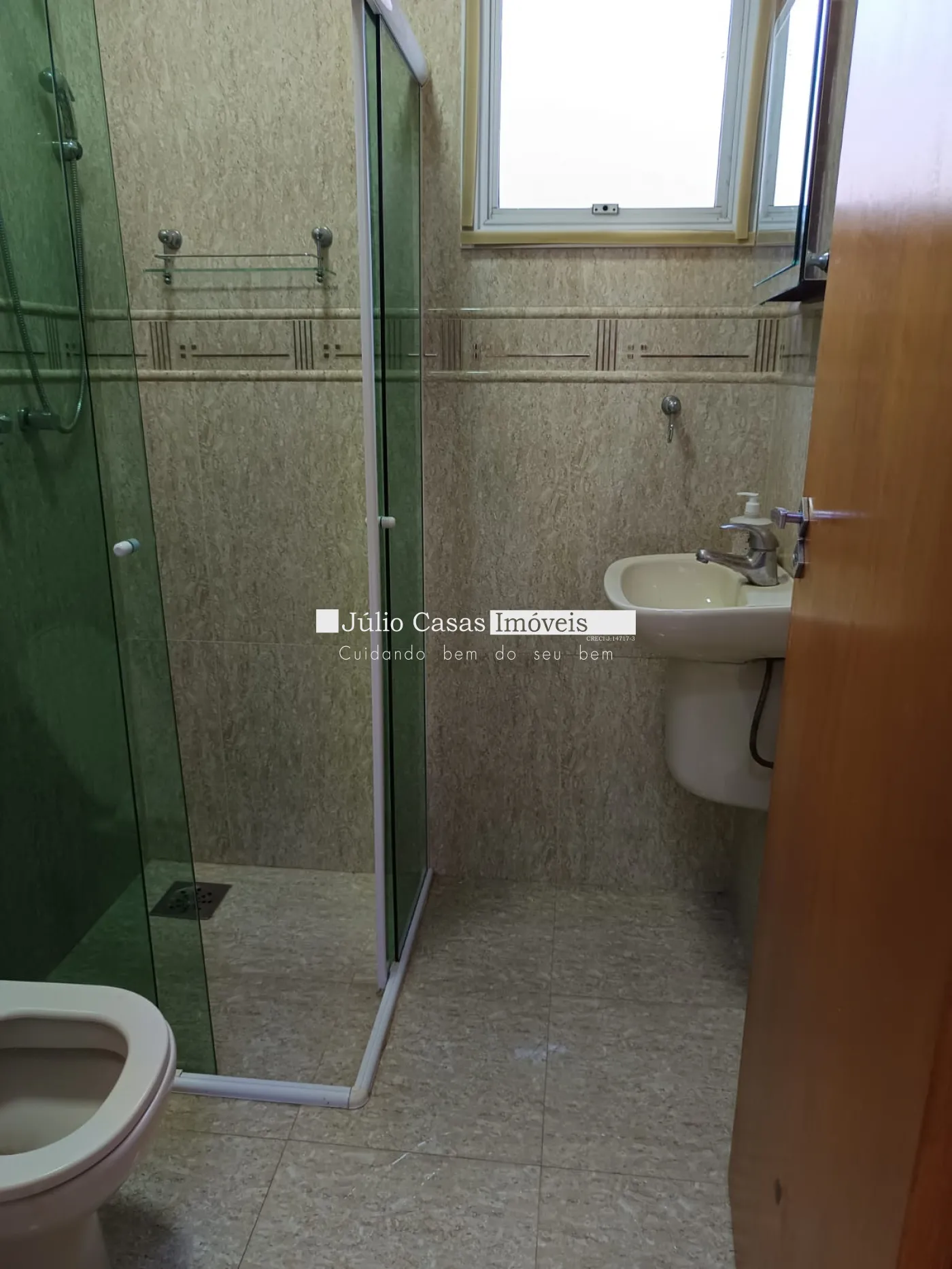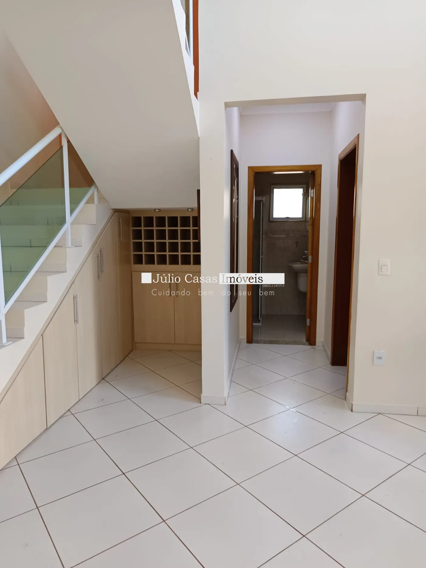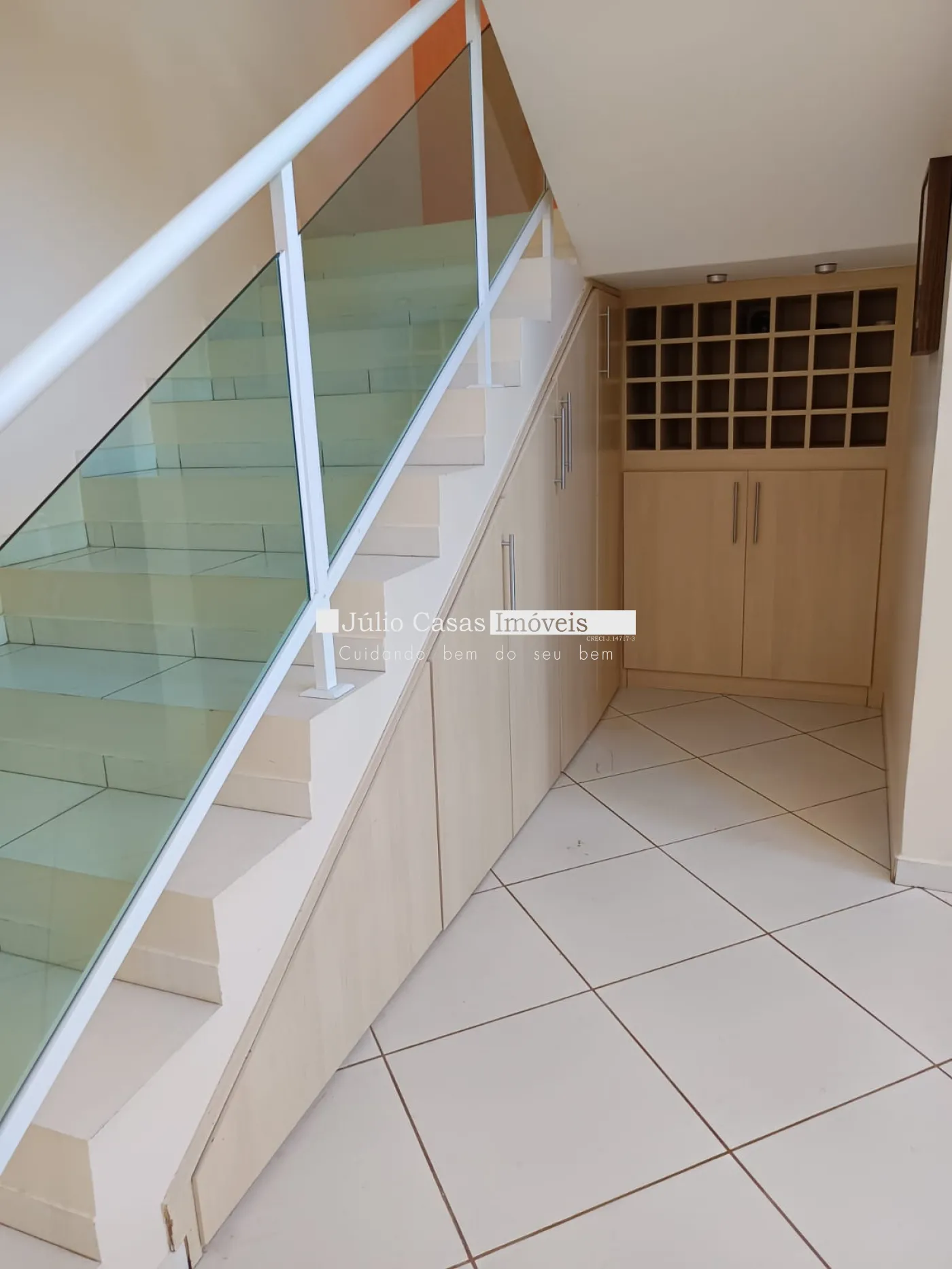 armário embaixo da escada. Banheiros com box em vidro e gabinetes