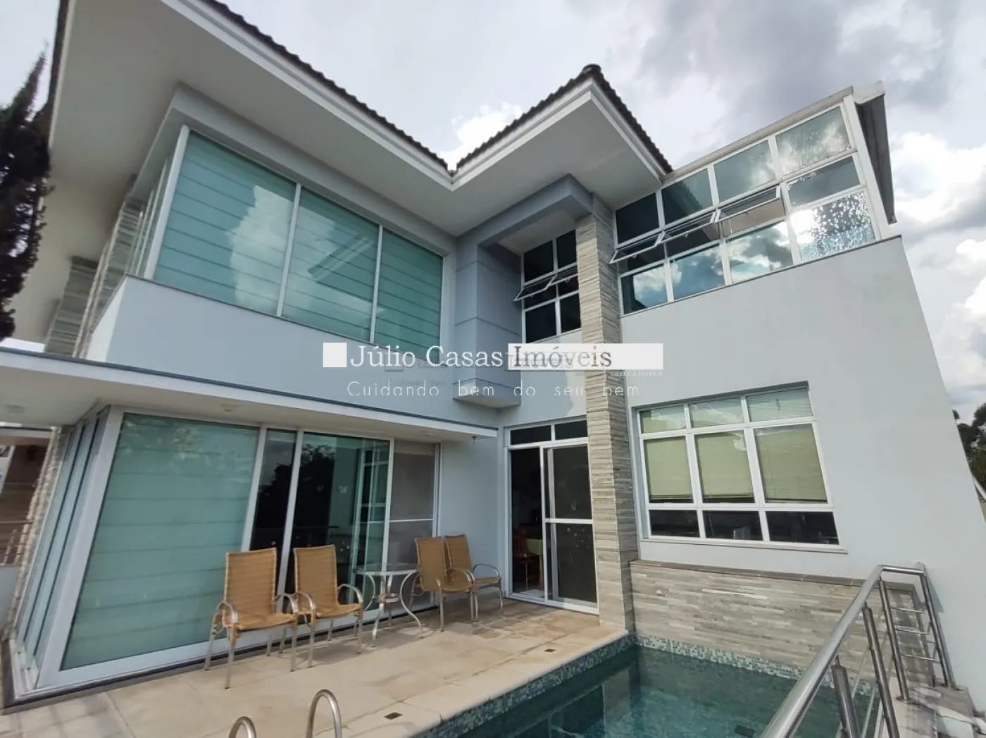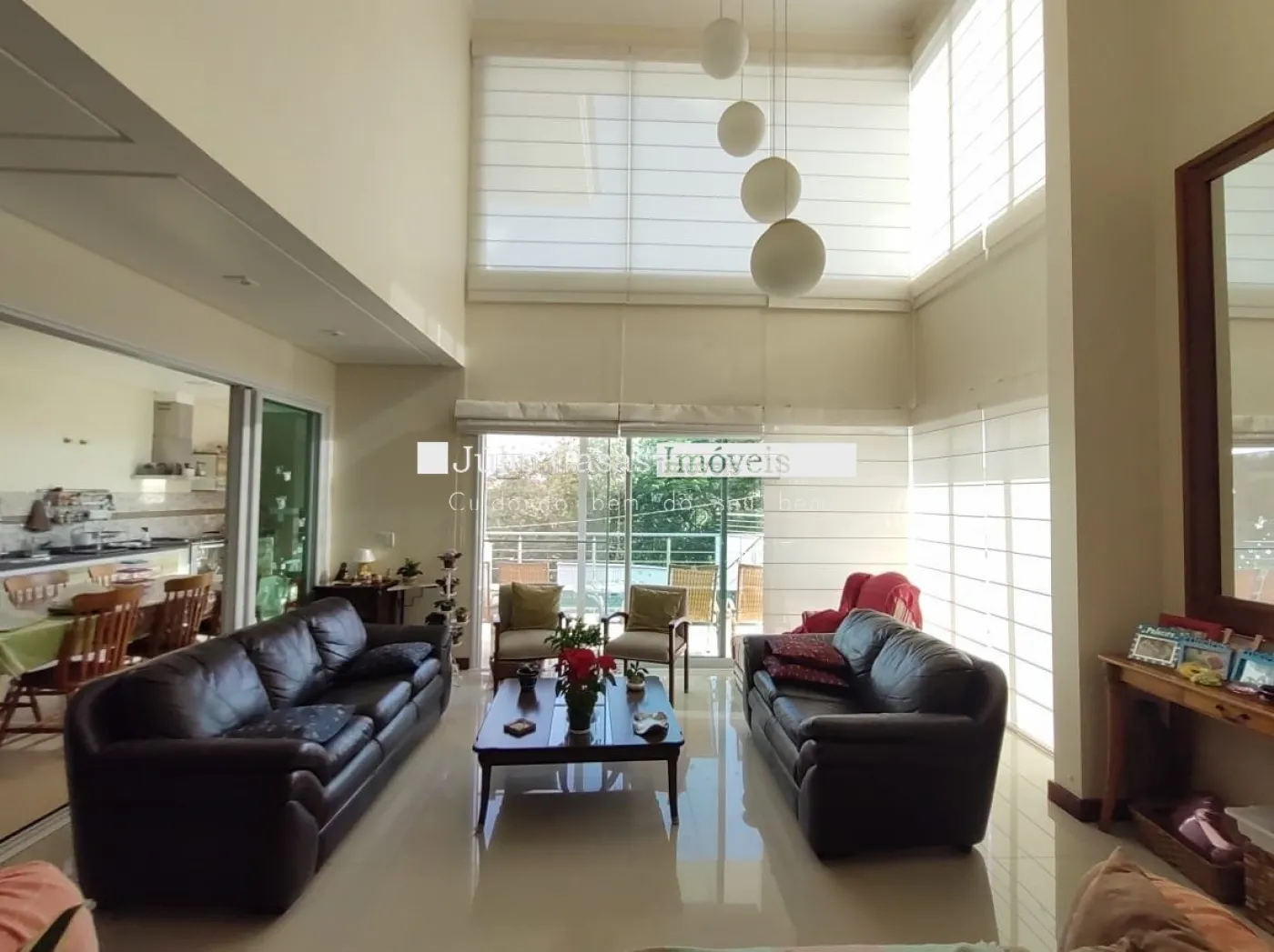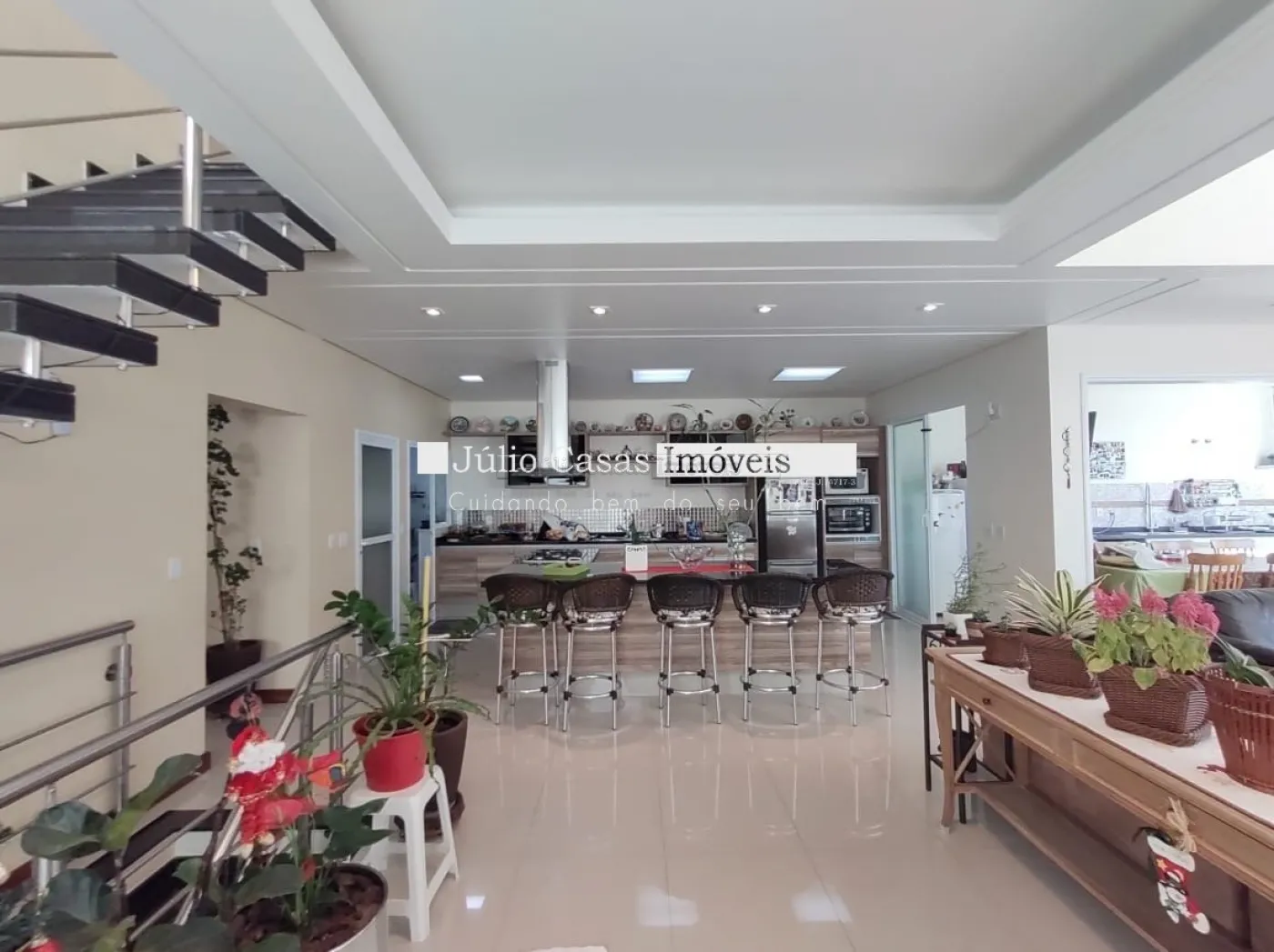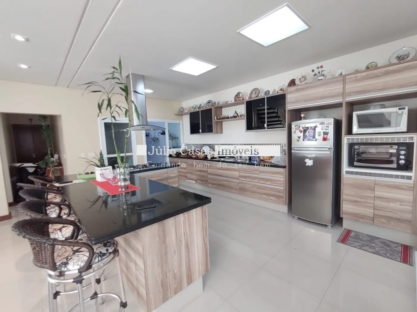 Sala 2 ambientes com pé direito 7 metros, acabamento em gessos com luminárias embutidas, piso em porcelanato, sala integrada com a cozinha e varanda gourmet. Cozinha estilo americana com ilha em granito, bancada, despensa com prateleiras em granito e modulados, coifa em inox, acabamento de primeira linha, área gourmet com churrasqueira e forno, pia de apoio com modulados, piscina aquecida com vista para a mata, escritório com lavabo, 3 suítes moduladas uma com spa, closet e hidromassagem, 2 com varandas grandes, subsolo com salão grande, espaço para quarto, wc, depósito e copa com quintal privativo, podendo ser usado como casa de hóspede.