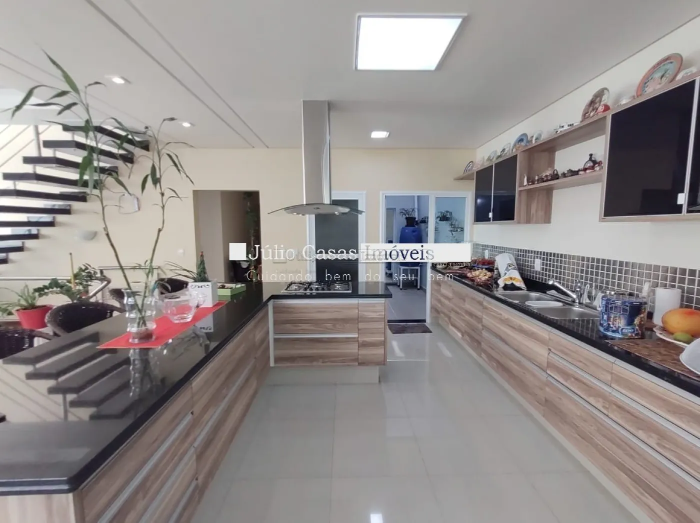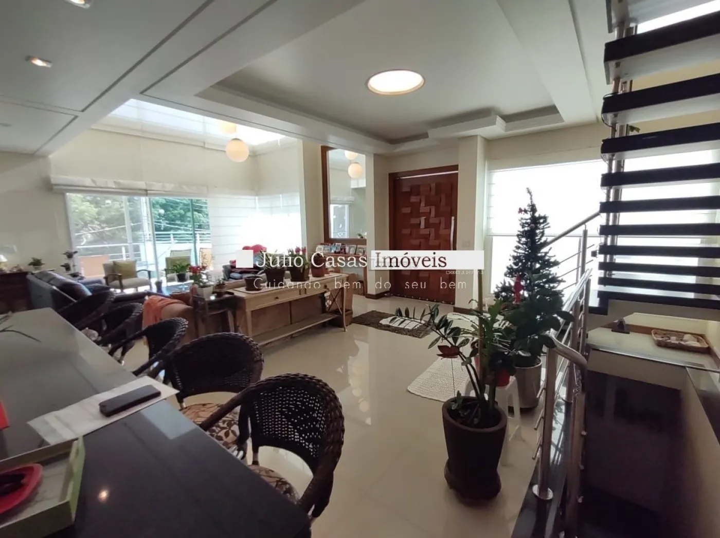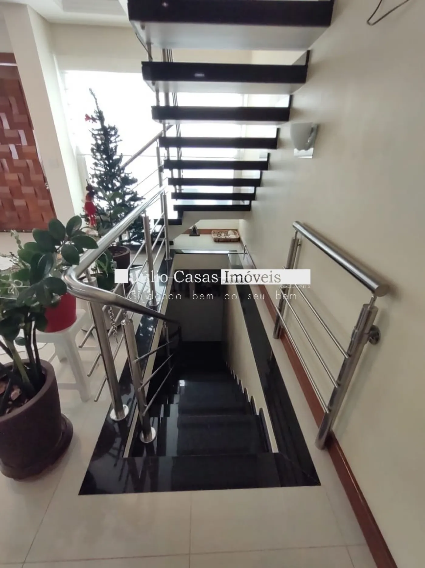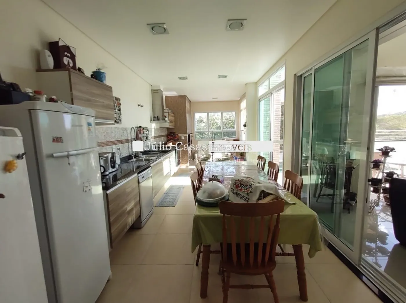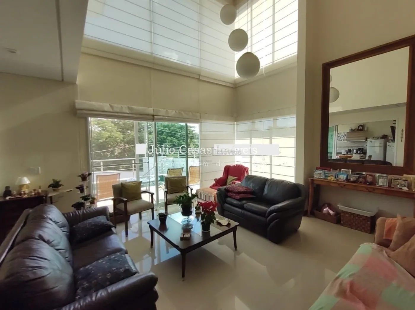 Sala 2 ambientes com pé direito 7 metros, acabamento em gessos com luminárias embutidas, piso em porcelanato, sala integrada com a cozinha e varanda gourmet. Cozinha estilo americana com ilha em granito, bancada, despensa com prateleiras em granito e modulados, coifa em inox, acabamento de primeira linha, área gourmet com churrasqueira e forno, pia de apoio com modulados, piscina aquecida com vista para a mata, escritório com lavabo, 3 suítes moduladas uma com spa, closet e hidromassagem, 2 com varandas grandes, subsolo com salão grande, espaço para quarto, wc, depósito e copa com quintal privativo, podendo ser usado como casa de hóspede.