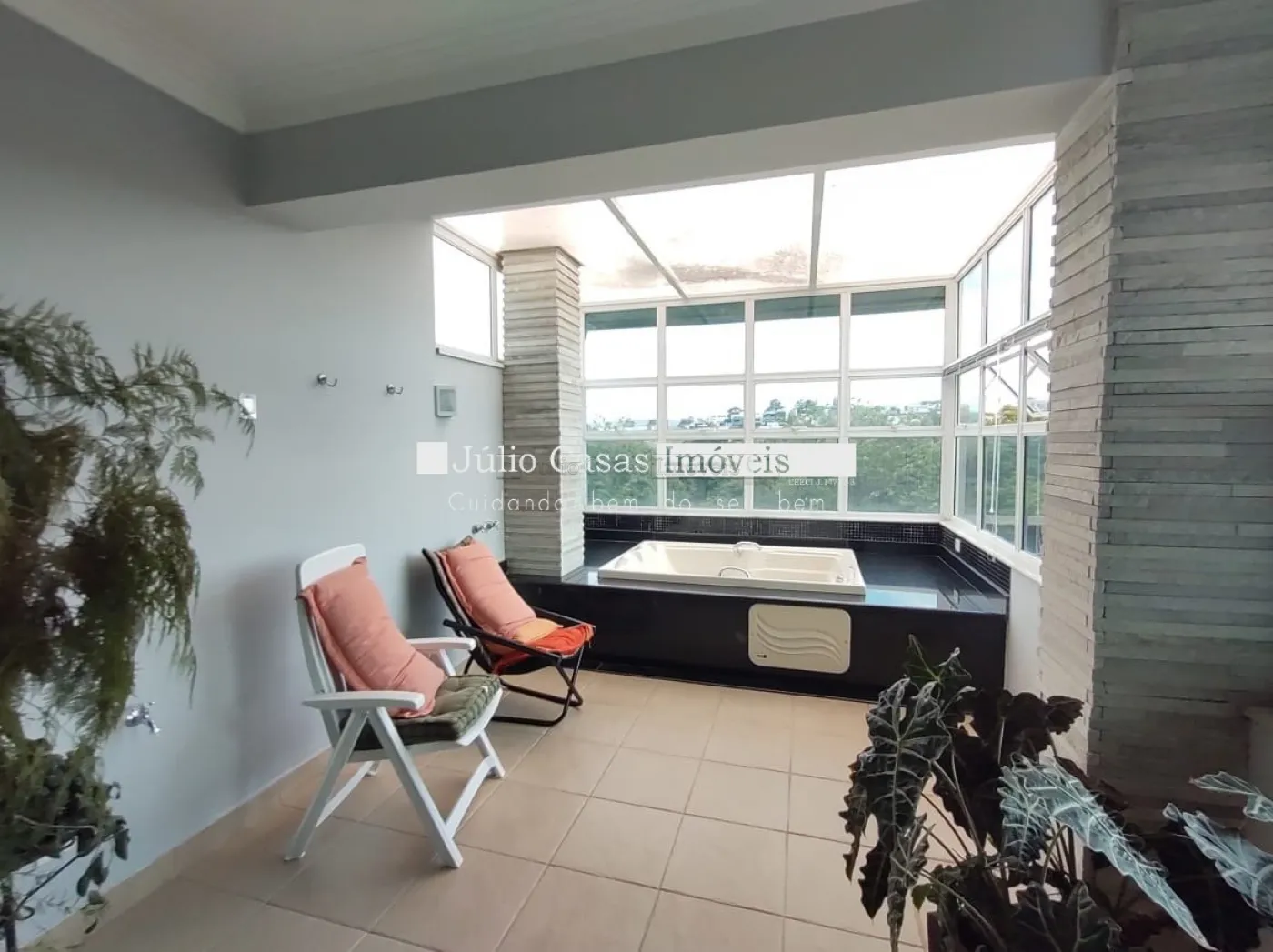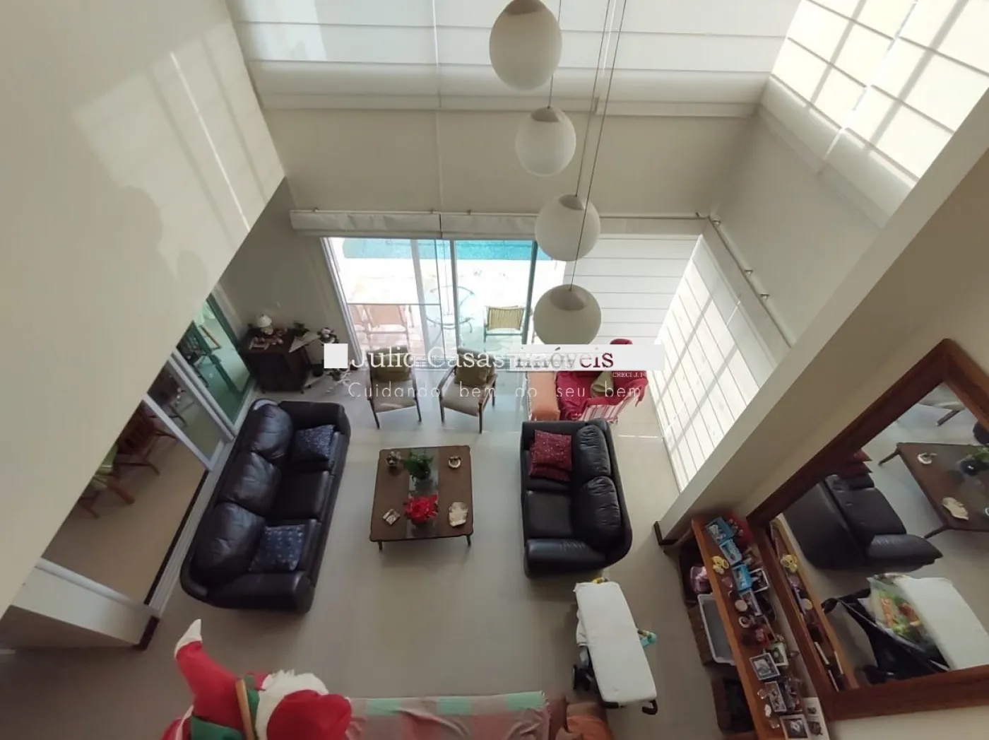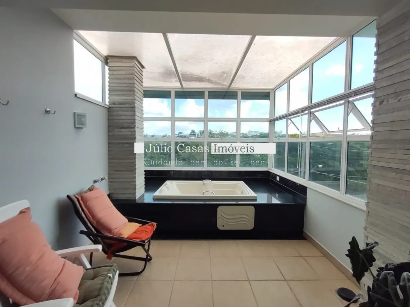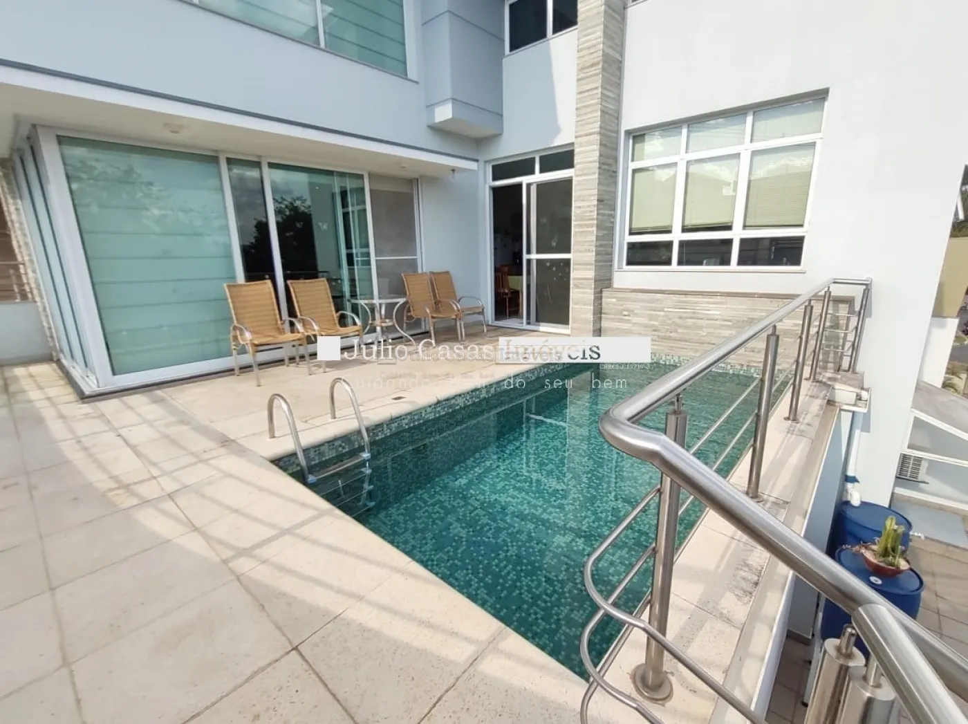 Sala 2 ambientes com pé direito 7 metros, acabamento em gessos com luminárias embutidas, piso em porcelanato, sala integrada com a cozinha e varanda gourmet. Cozinha estilo americana com ilha em granito, bancada, despensa com prateleiras em granito e modulados, coifa em inox, acabamento de primeira linha, área gourmet com churrasqueira e forno, pia de apoio com modulados, piscina aquecida com vista para a mata, escritório com lavabo, 3 suítes moduladas uma com spa, closet e hidromassagem, 2 com varandas grandes, subsolo com salão grande, espaço para quarto, wc, depósito e copa com quintal privativo, podendo ser usado como casa de hóspede.